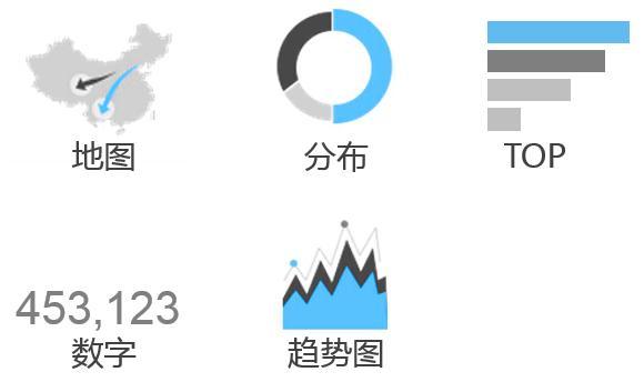 分析清楚數(shù)據(jù)后,就要找個合適的箱子把這些“蘋果”裝進(jìn)去。上一步,或許還可以靠自身的邏輯能力,采集到的現(xiàn)成數(shù)據(jù)分析得到,而這一步更多地需要經(jīng)驗(yàn)和閱歷。幸運(yùn)的是,現(xiàn)在已經(jīng)有很多成熟的圖形可以借鑒了。從和業(yè)務(wù)的溝通了解到,需要匹配的圖形有中國地圖、餅圖、top圖、數(shù)字、趨勢等。