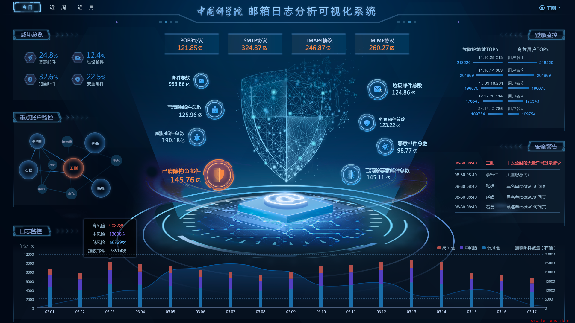 藍(lán)藍(lán)設(shè)計(jì)也在給中科院各個院所設(shè)計(jì)界面,上圖是給郵箱日志分析可視化系統(tǒng)設(shè)計(jì)的界面概念稿。為了設(shè)計(jì)好,我們搜集了各種資料文章和行業(yè)界面參考,了解郵件系統(tǒng)的行業(yè)術(shù)語,畫出交互原型、視覺設(shè)計(jì)稿。