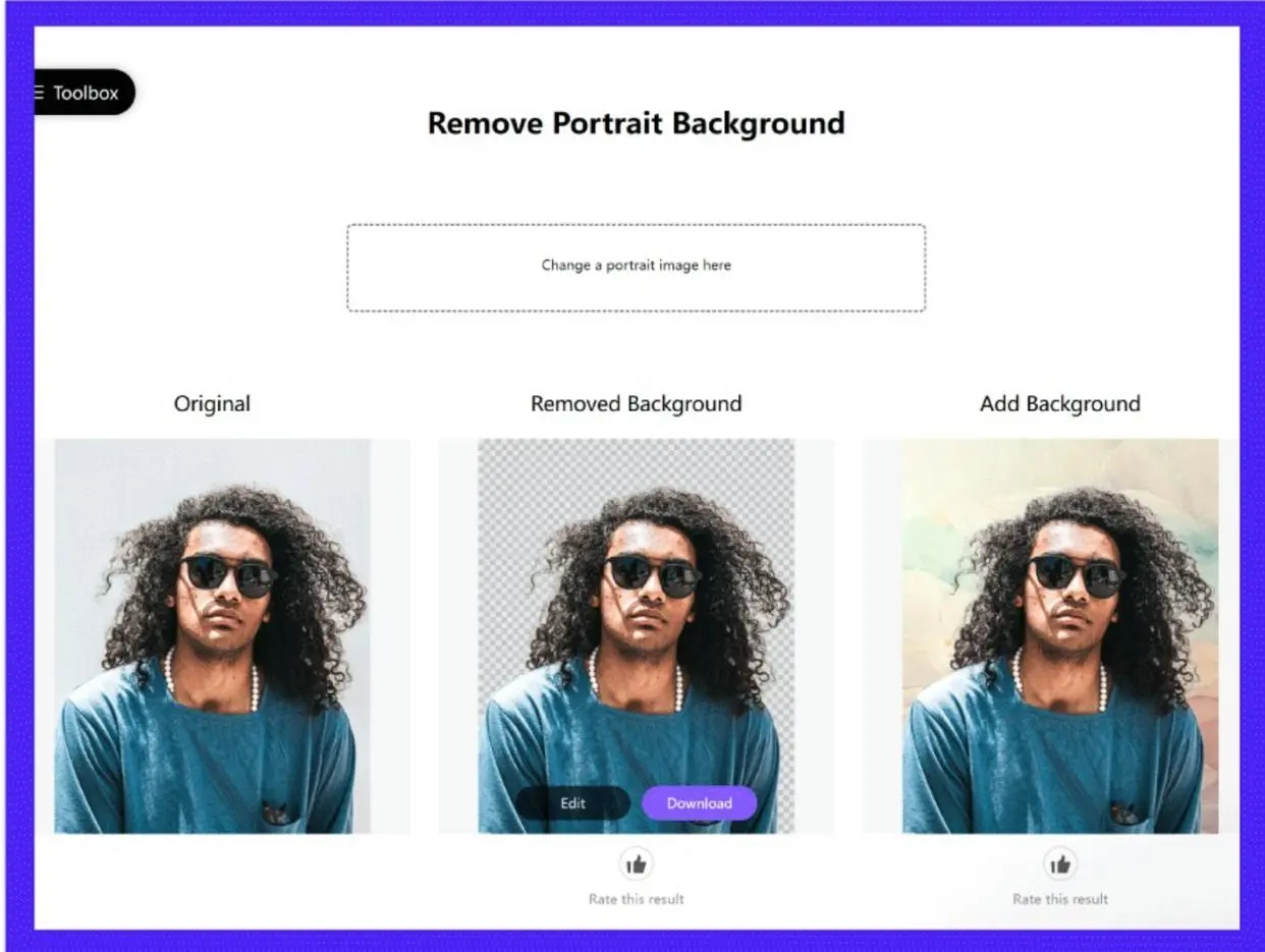 Toolkit 是一個(gè)多功能的圖片處理網(wǎng)站,其中就包括一鍵人像摳圖的功能。同樣是免費(fèi)使用,無需登錄注冊。進(jìn)入網(wǎng)頁后,上傳本地圖像網(wǎng)頁就會開始自動處理,支持為摳圖后的人像添加自定義背景。