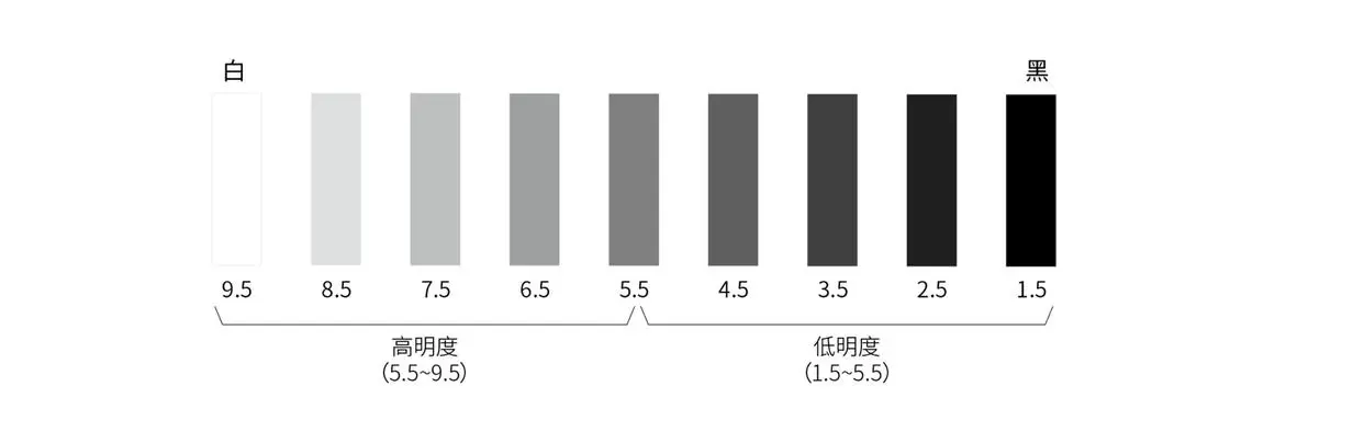 CCS 色彩體系將明度分為 17 級,每 0.5 級為一個(gè)階梯。為了方便理解,我們也可以粗略地分為 9 級,黑為 1.5,白為 9.5;以 5.5 級灰為中間點(diǎn),1.5~5.5 為低明度,5.5~9.5 為高明度。明度差越大顏色對比越明顯,明度差越小則對比越弱。