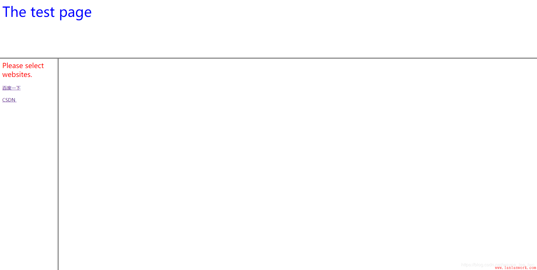 <!--selection_bar--> <html> <head></head> <body> <font size="5" color="red"> Please select websites. </font> <br /><br /> <a target="output_page"/>百度一下<br /><br /> <a target="output_page"/>CSDN <br /><br /> </body> </html>