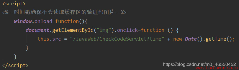在這里,因?yàn)辄c(diǎn)擊驗(yàn)證碼更換操作需要用到j(luò)s,所以我百度得到了上圖這樣一串代碼。其中時(shí)間戳的作用是通過改變每次請求的時(shí)間參數(shù)來獲得刷新效果,即改變url中的響應(yīng)頭信息。