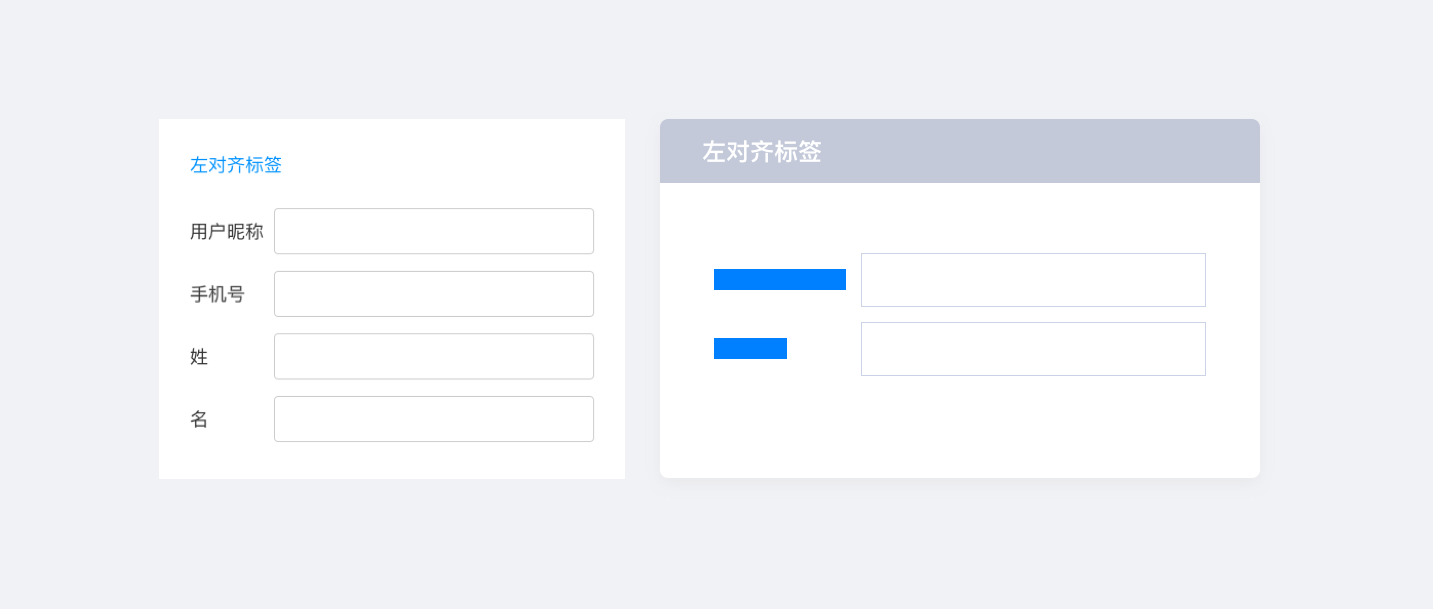 左對(duì)齊標(biāo)簽使用場景:需要用戶謹(jǐn)慎填寫的情況下推薦使用左側(cè)對(duì)齊標(biāo)簽。