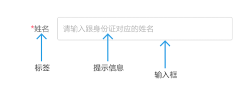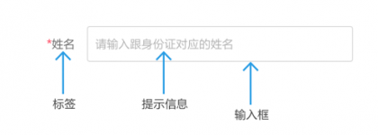 一個輸入框,通常有標(biāo)簽名稱label、提示信息placeholder(輸入信息后提示文字消失)、初始值value(需手動刪除)。如果是必填表單,在適當(dāng)位置(標(biāo)簽的前后,輸入框后)加上紅色*號(或其他符號)
