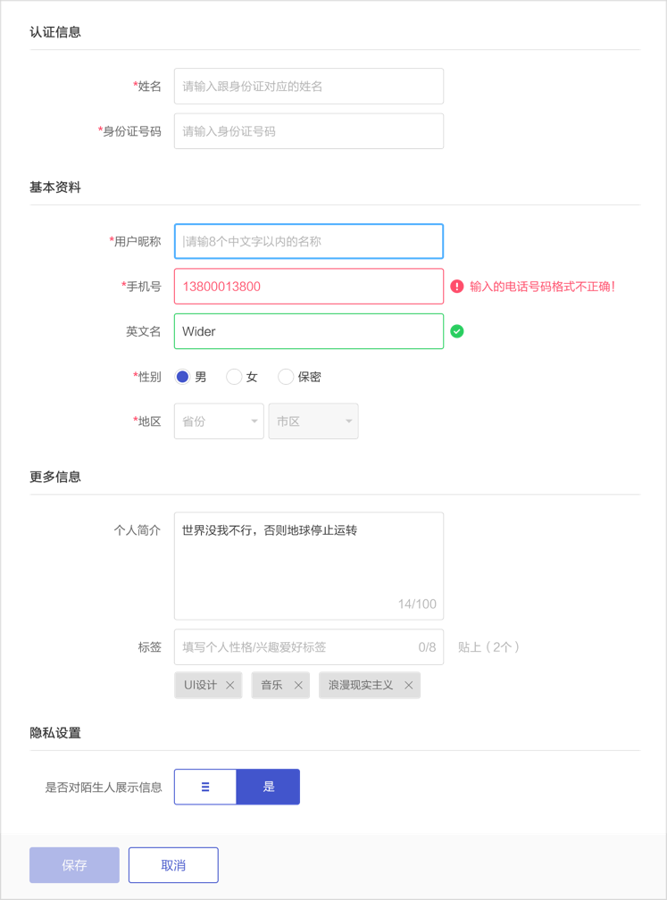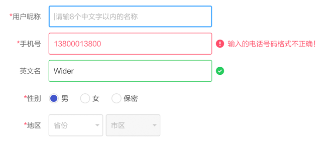 當(dāng)輸入有誤時,盡量避免彈出框提示,可以直接對輸入框設(shè)計(jì)不同的狀態(tài)顯示默認(rèn)狀態(tài)、選中狀態(tài)、錯誤狀態(tài)、成功狀態(tài)。