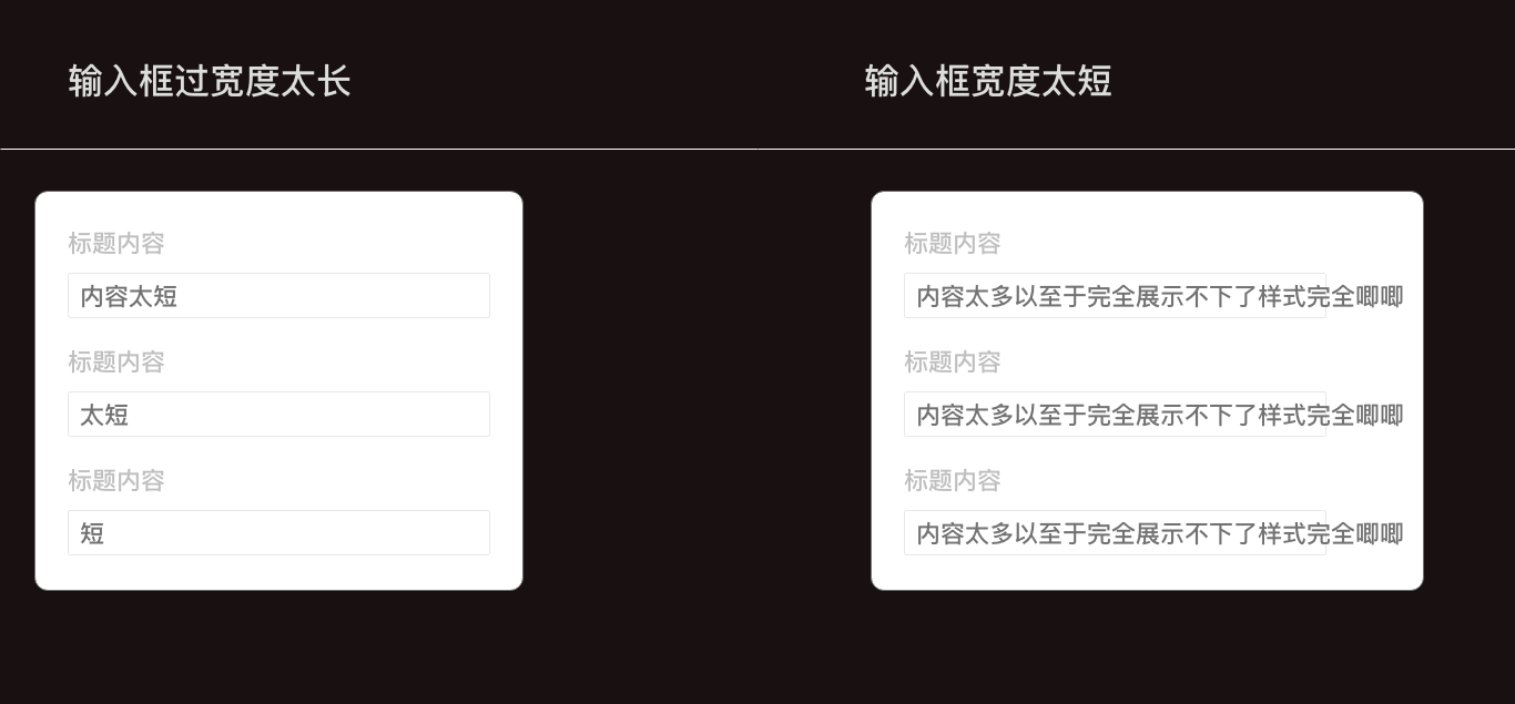采用這樣的處理方式時(shí),需要控制表單內(nèi)輸入內(nèi)容的長(zhǎng)度高度一致,不然會(huì)面臨以下兩種尷尬:面對(duì)尷尬一(長(zhǎng)度定太短)內(nèi)容擴(kuò)展性太差,無(wú)法同時(shí)滿足大段信息展示。面對(duì)尷尬一(長(zhǎng)度定太長(zhǎng))輸入框當(dāng)只填寫一兩個(gè)字符時(shí),會(huì)很空視覺(jué)效果不佳。