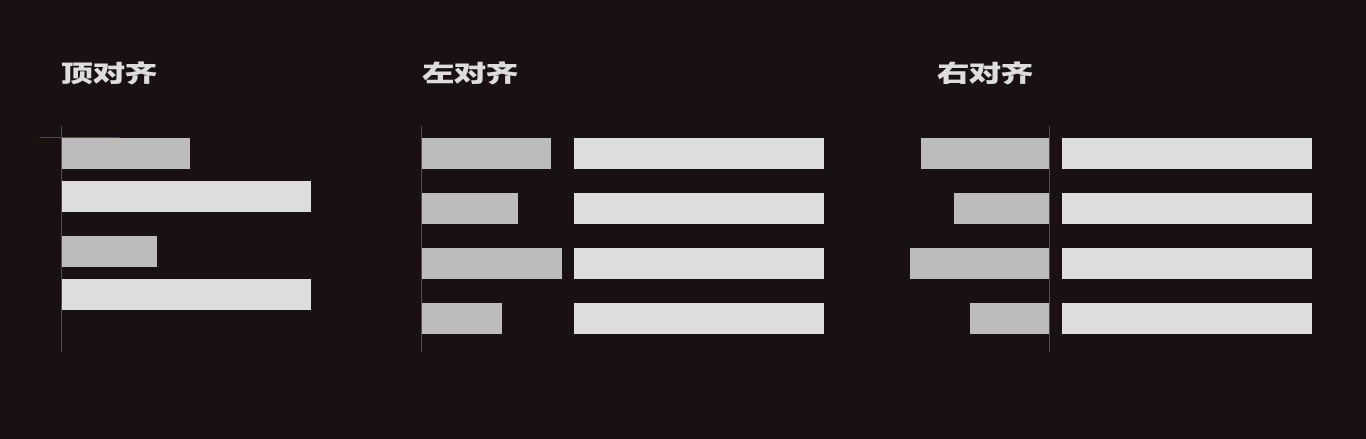 通常有三種對(duì)齊方式:頂對(duì)齊、左對(duì)齊、右對(duì)齊如圖例所示
