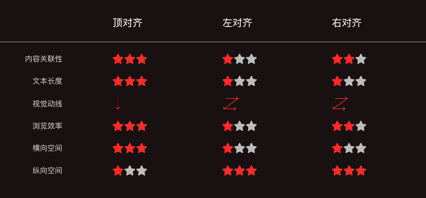 如何去選擇這三種對(duì)齊方式呢?我們從內(nèi)容關(guān)聯(lián)性、標(biāo)題長(zhǎng)度的靈活性、空間的占比、閱讀體驗(yàn)等幾個(gè)維度進(jìn)行優(yōu)劣分析。