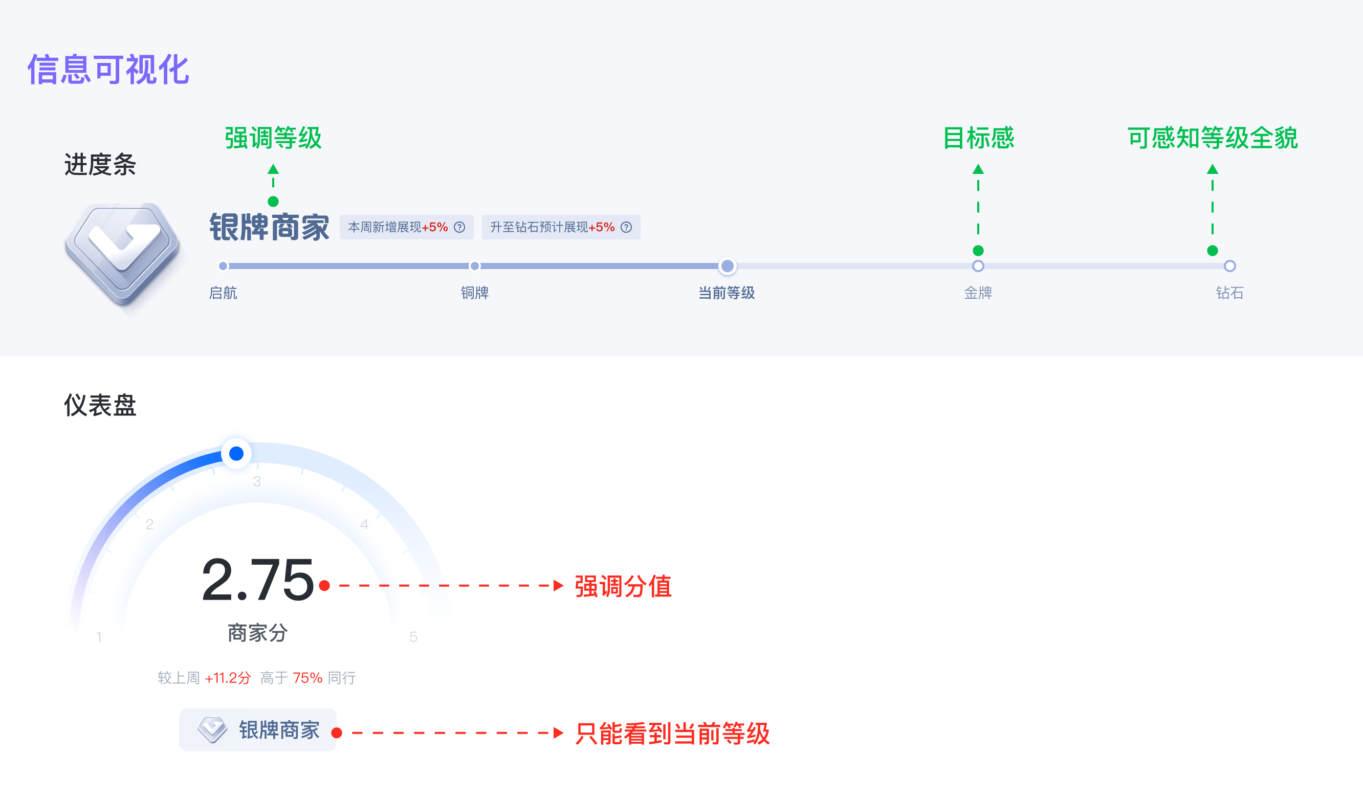 當(dāng)復(fù)雜的信息難以被商家理解時(shí),可視化作為有效手段,旨在把數(shù)據(jù)資料以視覺(jué)化的方式表現(xiàn)出,有效地向受眾傳播信息。可視化首先要根據(jù)信息結(jié)構(gòu)進(jìn)行圖表選型,在商家等級(jí)項(xiàng)目中,我選擇了兩種數(shù)據(jù)圖表(進(jìn)度條VS儀表盤)來(lái)進(jìn)行商家等級(jí)的可視化表達(dá),當(dāng)兩種圖表放到一起時(shí),可以很明顯的發(fā)現(xiàn)兩者之間的差異,基于這個(gè)項(xiàng)目想要強(qiáng)調(diào)的等級(jí)概念,最終選擇進(jìn)度條展示商家等級(jí)的成長(zhǎng)進(jìn)度,并激勵(lì)其追求下一個(gè)等級(jí)的提升。這樣,商家能夠準(zhǔn)確感知成長(zhǎng)進(jìn)度,衡量自己在商家等級(jí)體系里所處的分位以獲取更多成長(zhǎng)動(dòng)力。