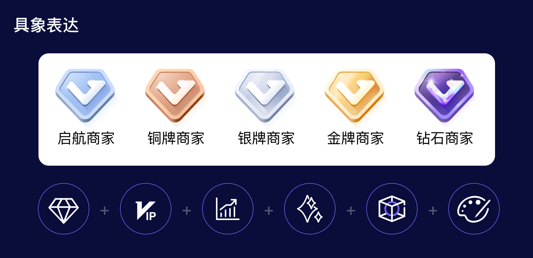具象表達(dá):有了設(shè)計(jì)關(guān)鍵詞,通過(guò)頭腦風(fēng)暴獲取了一些可以體現(xiàn)這些關(guān)鍵詞的具體事物:鉆石、VIP、箭頭、Blingbling、3D、金銀銅等,希望通過(guò)具象的事物表達(dá)抽象的情緒詞,于是我們從「鉆石」開(kāi)始入手,把鉆石和VIP、箭頭不斷結(jié)合,同時(shí)融入BlingBling,金銀銅色等具有普遍認(rèn)知的元素,用偽3D效果來(lái)增加徽標(biāo)的立體感,最終打造一種獎(jiǎng)牌的形態(tài),給客戶帶來(lái)更多榮譽(yù)感知,突出商家等級(jí)的重要性。