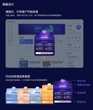 浮層:將操作入口前置披露,提升商家感知同時(shí)還可以縮短操作步長(zhǎng)。在商家等級(jí)項(xiàng)目里,衡量商家主動(dòng)經(jīng)營(yíng)的標(biāo)準(zhǔn)是做任務(wù),所以任務(wù)入口的前置披露是提升主動(dòng)經(jīng)營(yíng)的關(guān)鍵舉措。于是,圍繞商家等級(jí)包裝了“經(jīng)營(yíng)助手”的概念,幫助平臺(tái)給商家推薦一些成長(zhǎng)任務(wù)和優(yōu)化建議,并在平臺(tái)首頁(yè)主動(dòng)彈出,以此提高任務(wù)觸達(dá)率。但使用這種主動(dòng)觸達(dá)手段時(shí),需要考慮對(duì)商家的打擾和阻斷情況,所以需要對(duì)主動(dòng)彈出的頻率作限制,然后配合氣泡和標(biāo)簽等視效元素吸引商家視線。這樣可以引導(dǎo)商家參與商家等級(jí)完成任務(wù),促進(jìn)其成長(zhǎng)和等級(jí)提升。