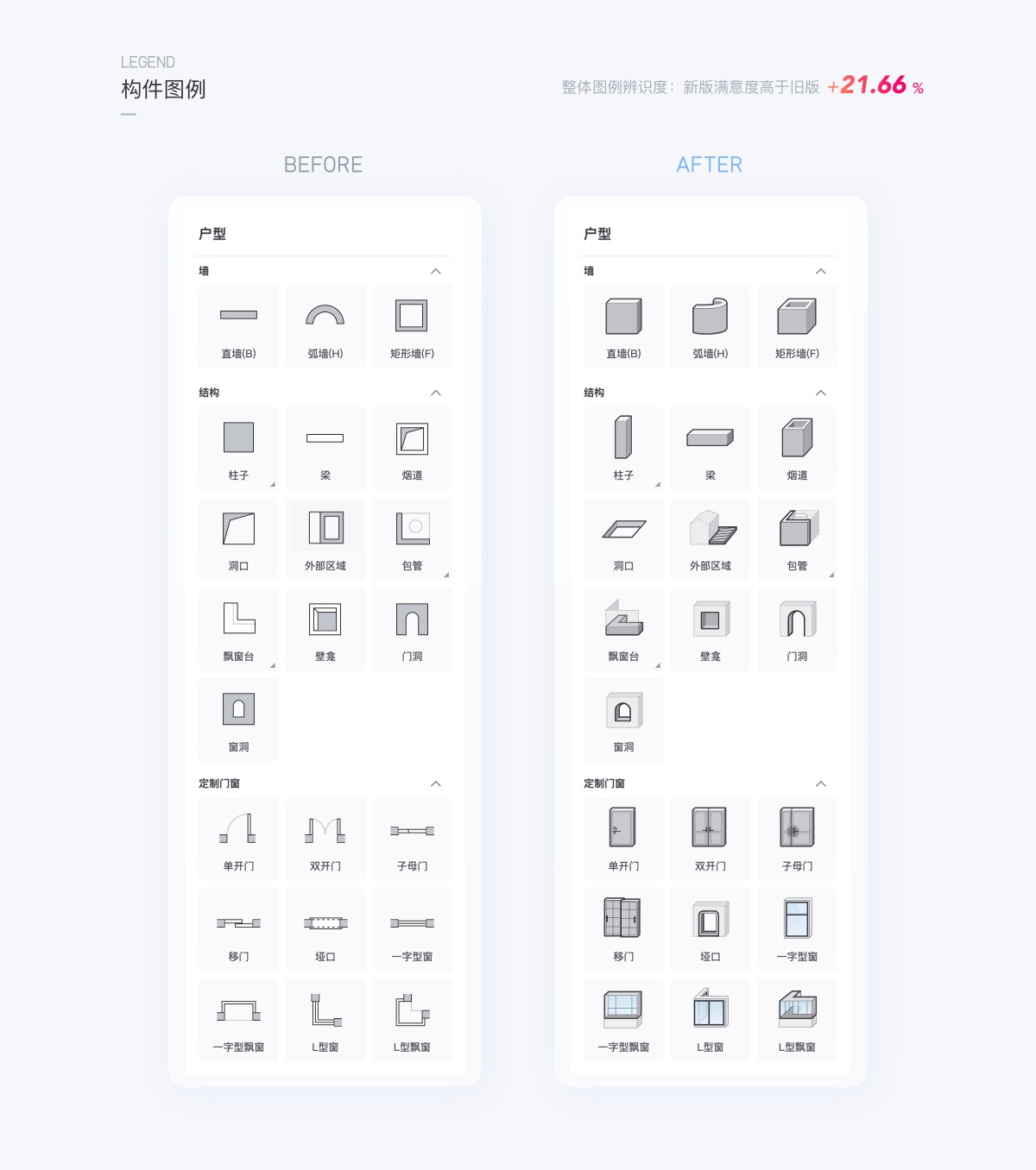 上線后通過問卷調(diào)研用戶滿意度相比舊版提升了21.66%,因此可以證明,更精準(zhǔn)的圖形輔助用戶更高效的使用工具操作。以上是項(xiàng)目小組在試驗(yàn)過程中的部分案例,不再一一列舉所有的試驗(yàn)案例,可以看到信息表達(dá)的精準(zhǔn)度、直觀度是能夠?qū)I(yè)務(wù)產(chǎn)生直接的正向結(jié)果,鑒于群核下的工具產(chǎn)品有大量的應(yīng)用圖標(biāo)圖例,借此我們重新排查和校準(zhǔn)了很多圖標(biāo),確保表達(dá)相對精準(zhǔn),提高用戶信息識別的精準(zhǔn)度與效率。