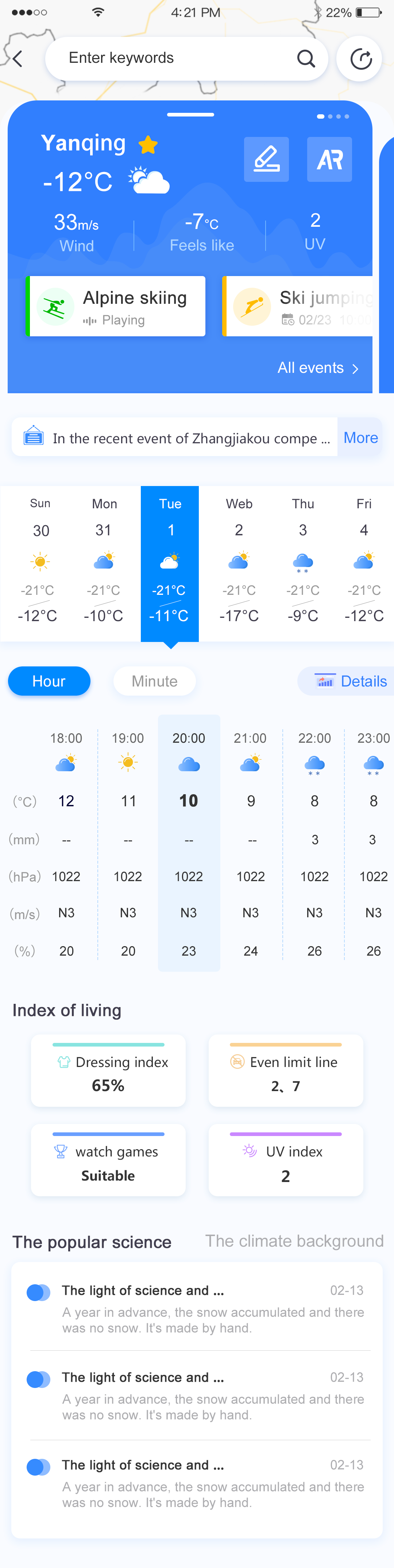 實(shí)況模塊,當(dāng)用戶在京津冀地區(qū)時(shí),進(jìn)入主頁(yè)便會(huì)顯示當(dāng)前位置的的實(shí)況信息,當(dāng)用戶不在時(shí)便會(huì)顯示為“北京賽區(qū)”的實(shí)況信息。點(diǎn)擊地點(diǎn)名稱旁邊的小箭頭,可以切換到其它賽區(qū)或者站點(diǎn)的實(shí)況天氣。實(shí)時(shí)信息往上滑動(dòng)便可以查看更多的氣象要素信息,如下圖。