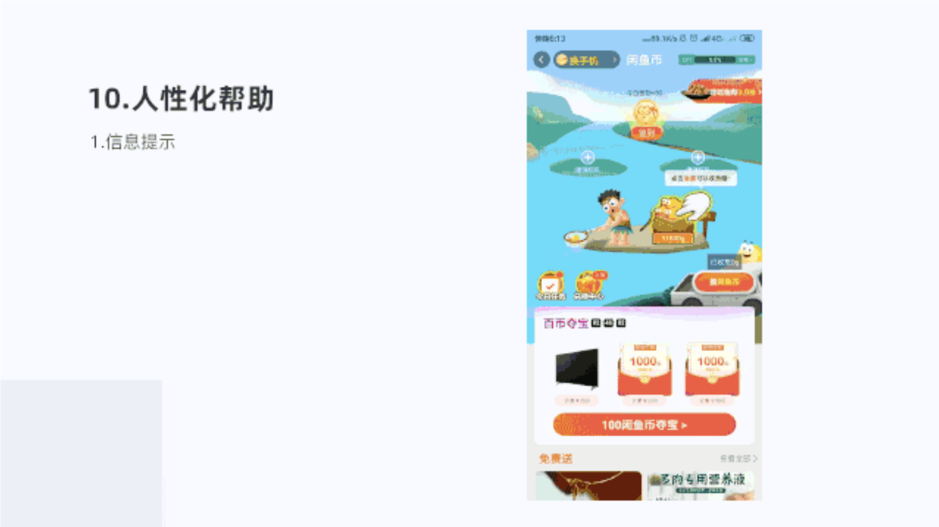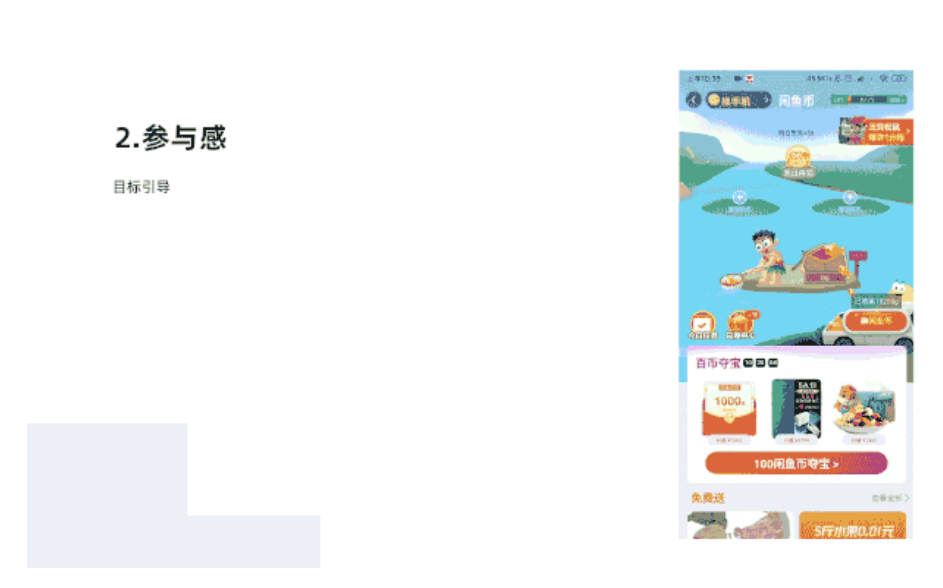 目標(biāo)引導(dǎo)設(shè)計,劃定規(guī)則和目標(biāo)路徑,引導(dǎo)用戶參與其中,在簽到活動頁面一個小路徑,用戶點擊撈魚,撈上來之后,就可以兌換閑魚幣了,讓用戶趣味游戲同時獲得閑魚幣,提升參與感,增強(qiáng)了用戶體驗。