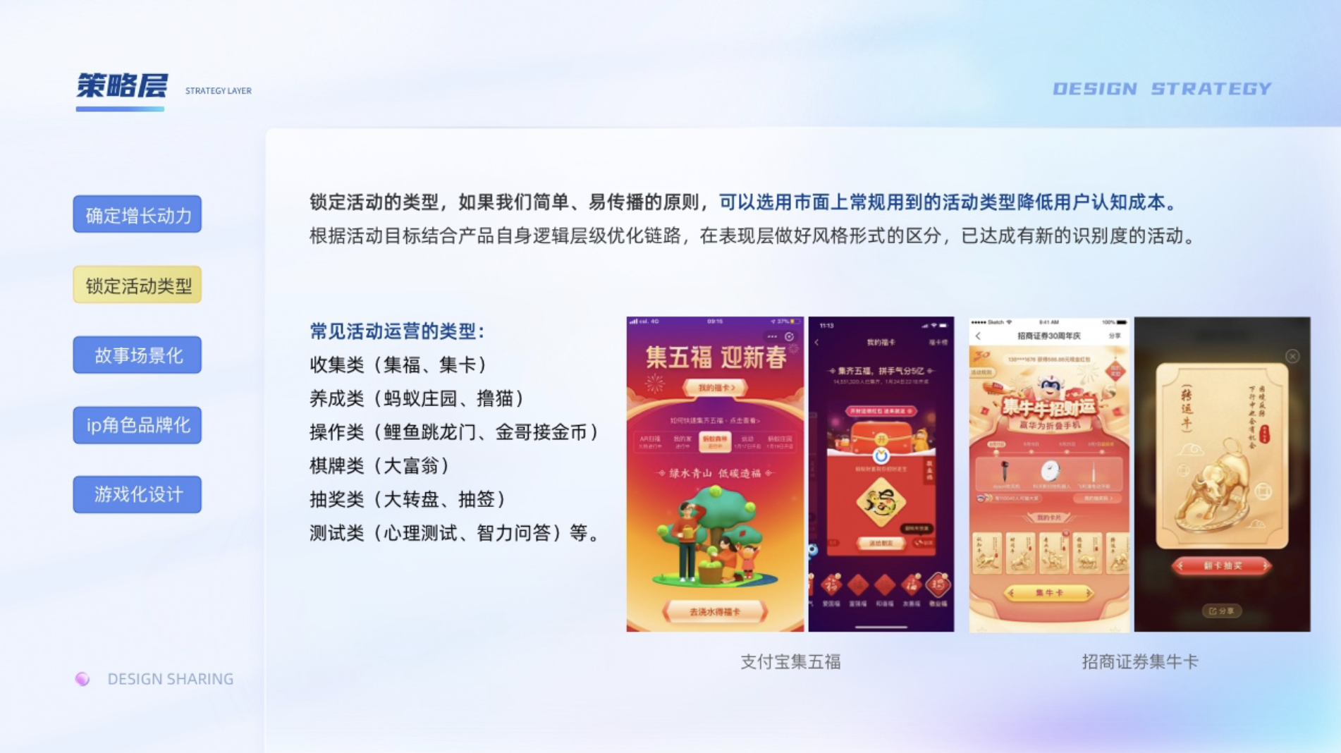 確定增長動力后,需要鎖定活動的類型。如果我們簡單、易傳播的原則,可以選用市面上常規(guī)用到的活動類型降低用戶認(rèn)知成本,對于一些比較有名的活動,像支付寶集五福,其本質(zhì)就是通過完成運營任務(wù)來收集某種虛擬物品,再由集齊的虛擬物品變現(xiàn)紅包完成用戶利益激勵。設(shè)計時不能完全照搬,既要根據(jù)活動目標(biāo)結(jié)合產(chǎn)品自身邏輯層級優(yōu)化鏈路,也要在表現(xiàn)層做好風(fēng)格形式的區(qū)分,已達成有新的識別度的活動。