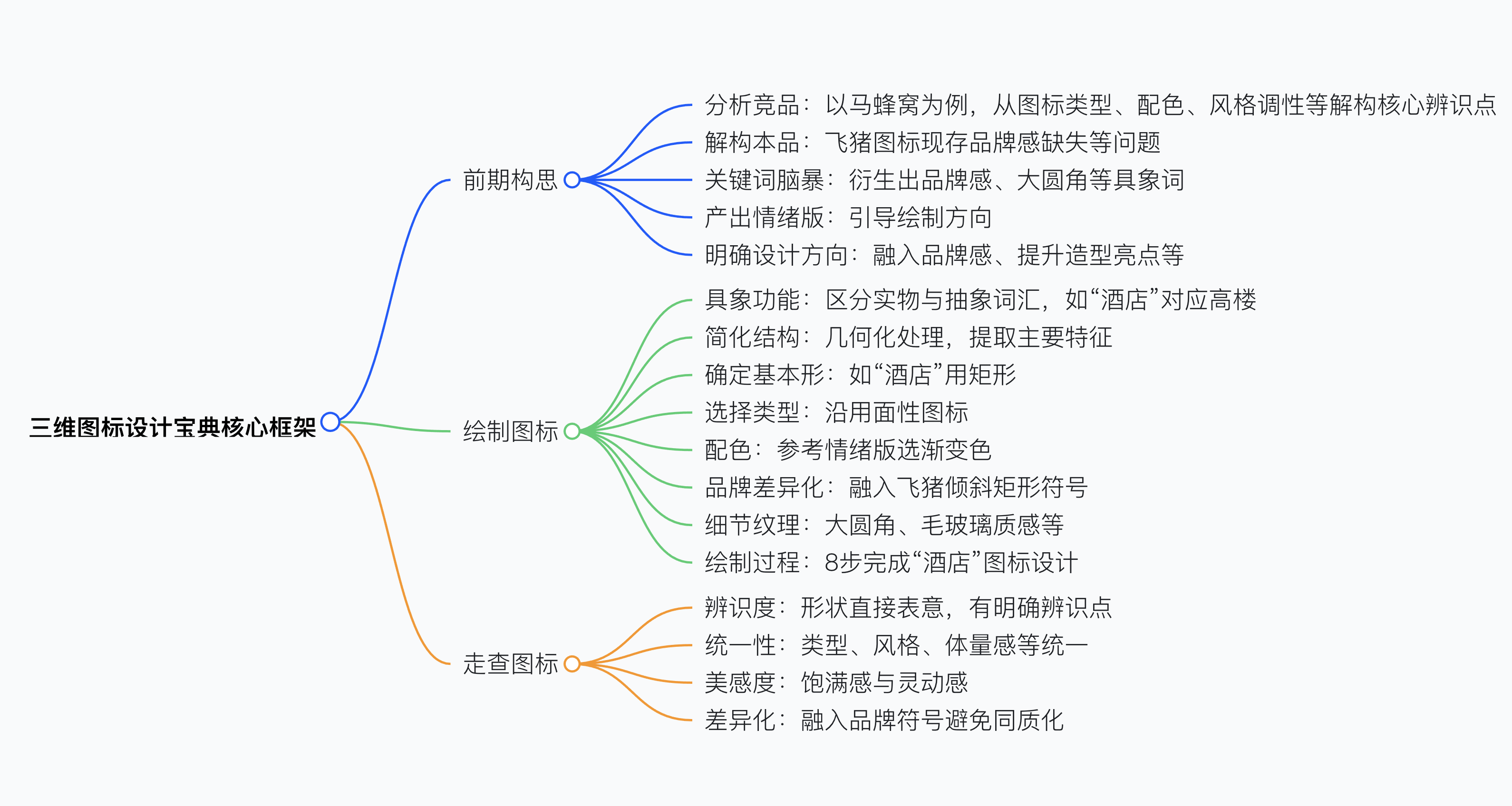 “三維圖標(biāo)設(shè)計(jì)寶典” 方法論,強(qiáng)調(diào)從前期構(gòu)思(分析競(jìng)品如馬蜂窩與本品飛豬的圖標(biāo)類型、配色、風(fēng)格及核心辨識(shí)點(diǎn),通過關(guān)鍵詞腦暴鎖定 “品質(zhì)、活力、青春” 方向并產(chǎn)出情緒版)、繪制圖標(biāo)(具象功能、簡化結(jié)構(gòu)、確定基本形,融入飛豬品牌超級(jí)符號(hào),添加毛玻璃質(zhì)感等細(xì)節(jié))到走查圖標(biāo)(從辨識(shí)度、統(tǒng)一性、美感度、差異化四方面檢查,如類型、風(fēng)格、體量感統(tǒng)一,融入品牌符號(hào)增強(qiáng)差異化)的完整流程,助設(shè)計(jì)師提升過稿率。