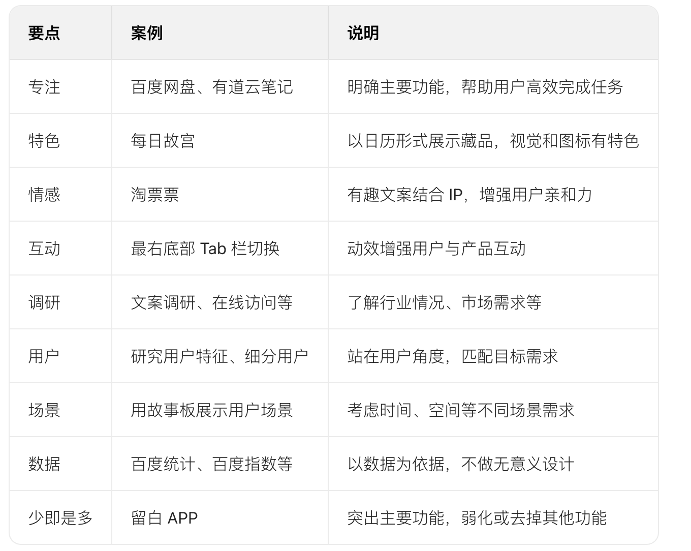 設計的最終目的是提高生活質量,設計前需思考設計思維模式(結構化解決以人為本的問題)、設計理念(以人為本確立主導思想),并進行案例分析(如百度網盤專注功能、每日故宮突出特色等 9 點);設計時要注意簡約(減少認知成本)、易用(功能一目了然)、視覺(抓住用戶眼球)等 12 點,涵蓋色彩、規(guī)范、習慣等方面,這些思考能提升設計效率與用戶體驗。