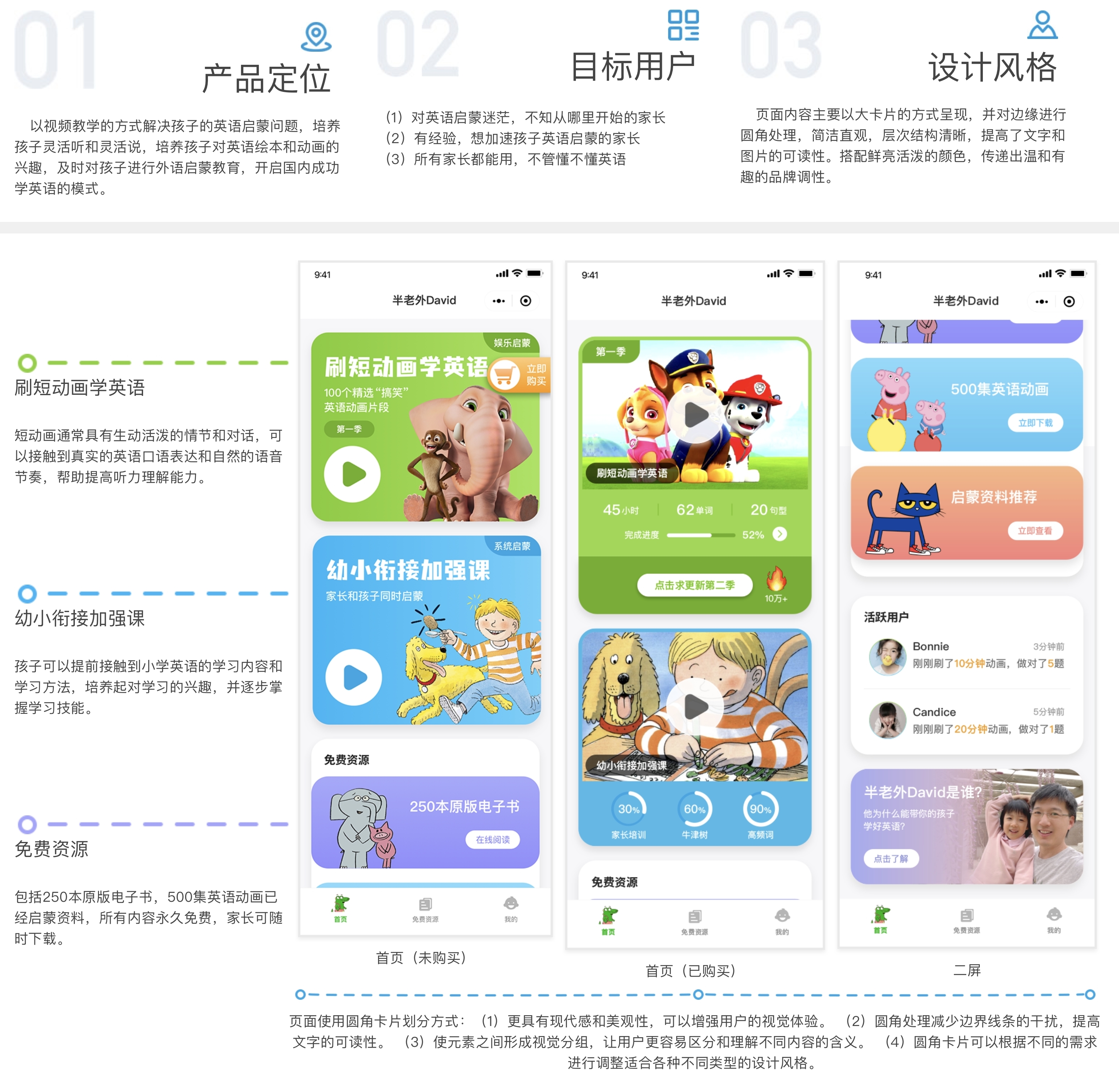 舉例來(lái)說(shuō),我們?cè)鵀橐粋€(gè)名為“半老外 David 英語(yǔ)啟蒙”小程序參與界面與交互設(shè)計(jì)。在這個(gè)面向兒童與家長(zhǎng)的英語(yǔ)學(xué)習(xí)產(chǎn)品中,為了提高用戶體驗(yàn)我們進(jìn)行視覺(jué)調(diào)整: