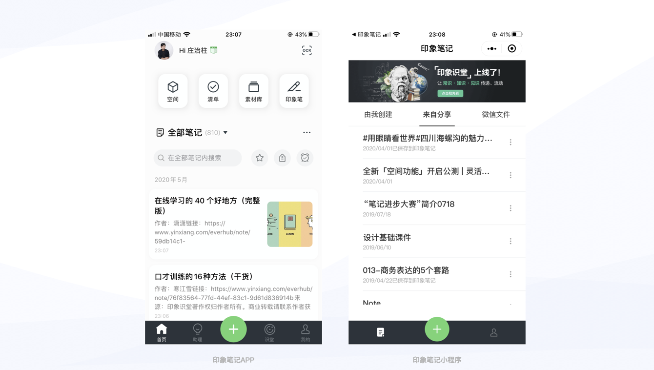 - 筆記類(如印象筆記):突出 “由我創(chuàng)建”“來自分享”“微信文件” 三個核心入口,方便用戶通過微信快速收集分享筆記,還支持一鍵導(dǎo)入微信文件,避免文件過期;