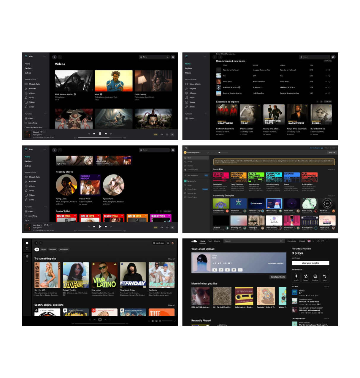 主內(nèi)容區(qū)卡片化:核心區(qū)域以卡片或模塊堆疊,內(nèi)容塊清晰(如“New albums”、“Community Examples”)。