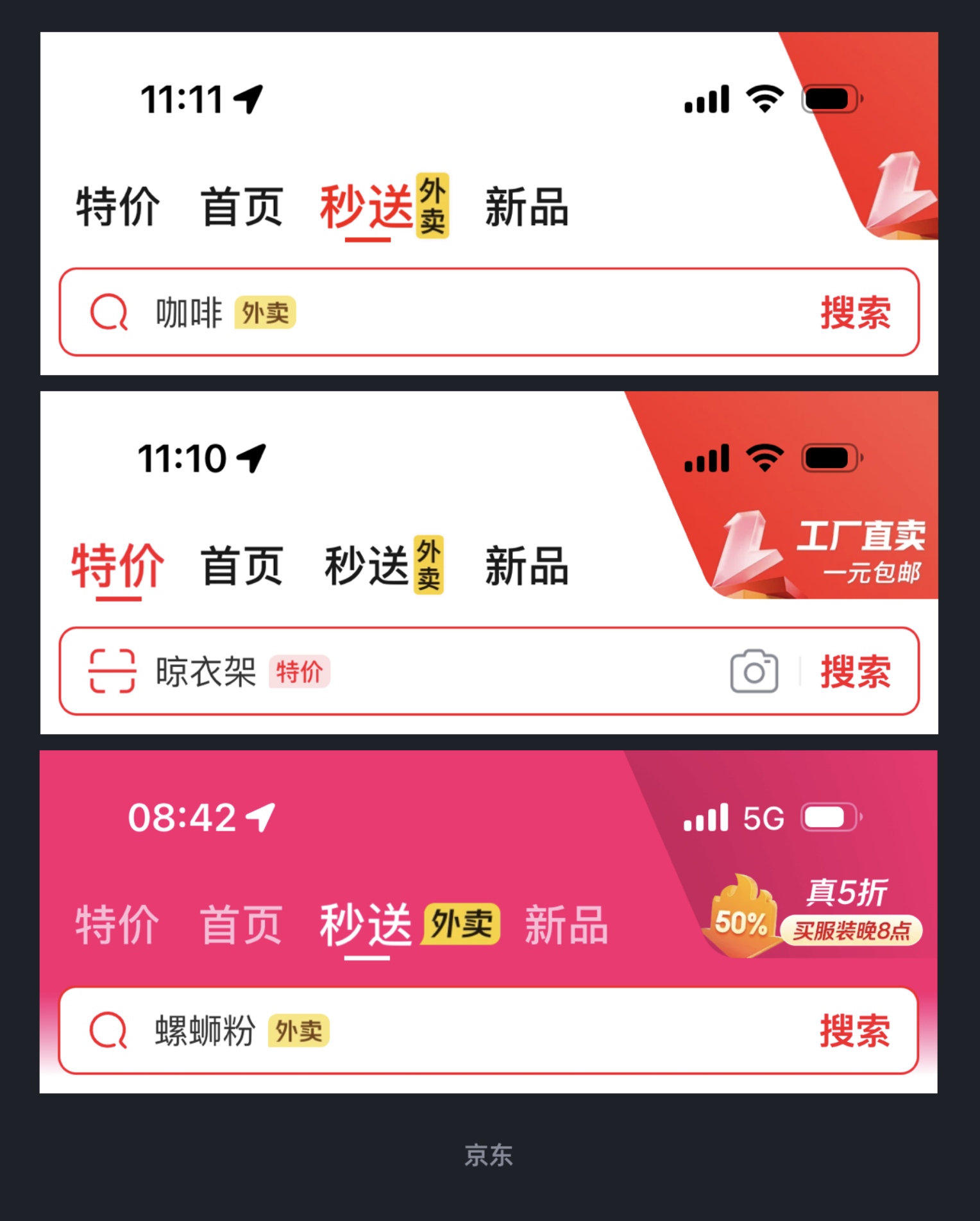 之前京東外賣還沒加入 “秒送” 欄目時,導航欄的布局有些失衡:左側是 “特價”“首頁” 等功能入口,右側只有搜索框,中間和右側有不少空白。后來京東把外賣業(yè)務納入 “秒送” 欄目,在導航欄右側加了一個 “外賣” 營銷入口 —— 這個小小的改動,不僅讓導航欄左右布局更對稱,還充分利用了之前的空白區(qū)域,拓展了營銷接口。用戶點進 “外賣” 就能直接下單,不用再從首頁層層尋找,既提升了轉化,又讓界面更規(guī)整。