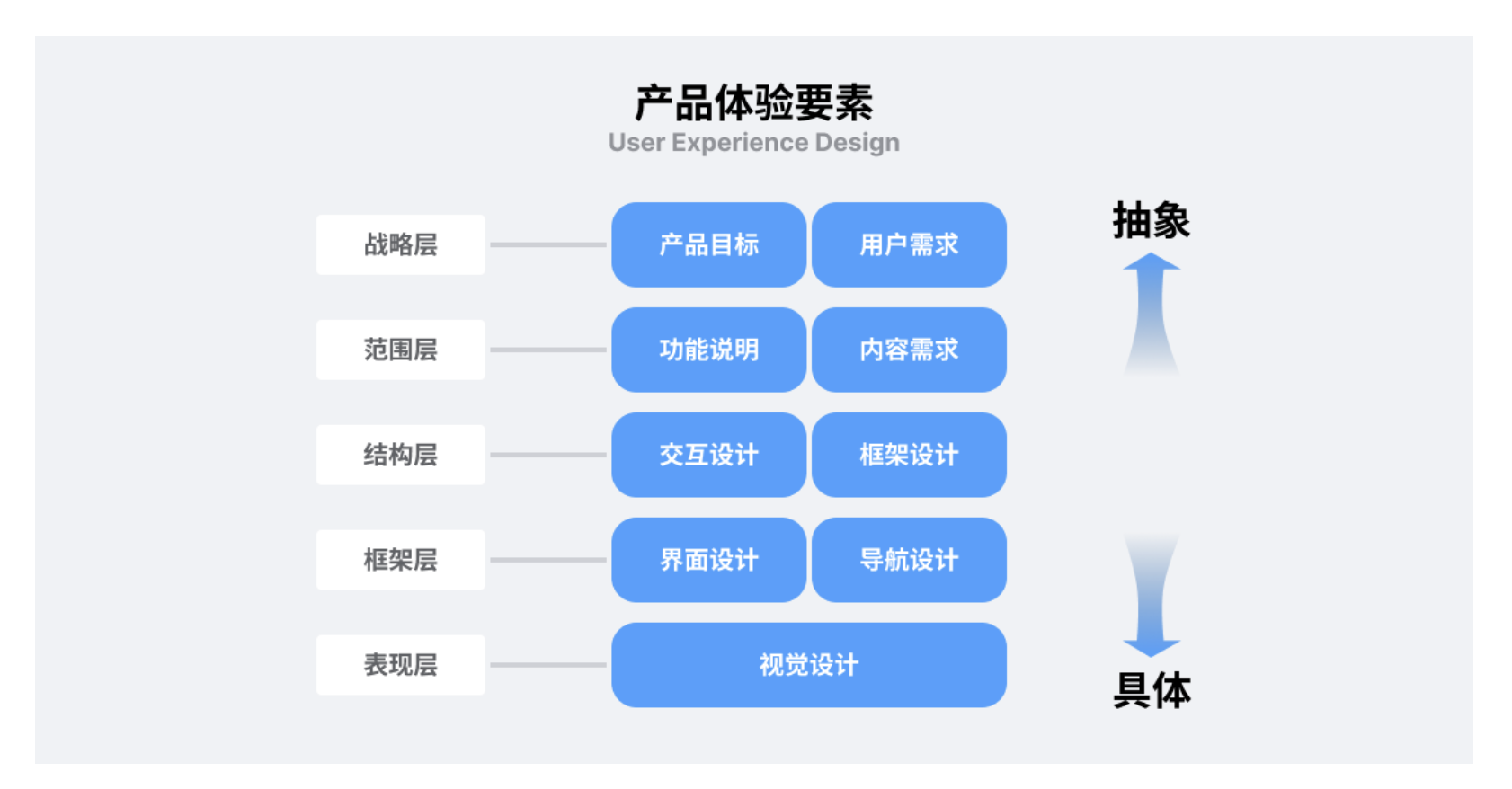 要理解它的核心,繞不開經(jīng)典的產(chǎn)品體驗五層級模型。這五個層級從抽象到具體,像搭建一座房子一樣層層遞進(jìn),少了任何一層,體驗都會 “塌掉”: