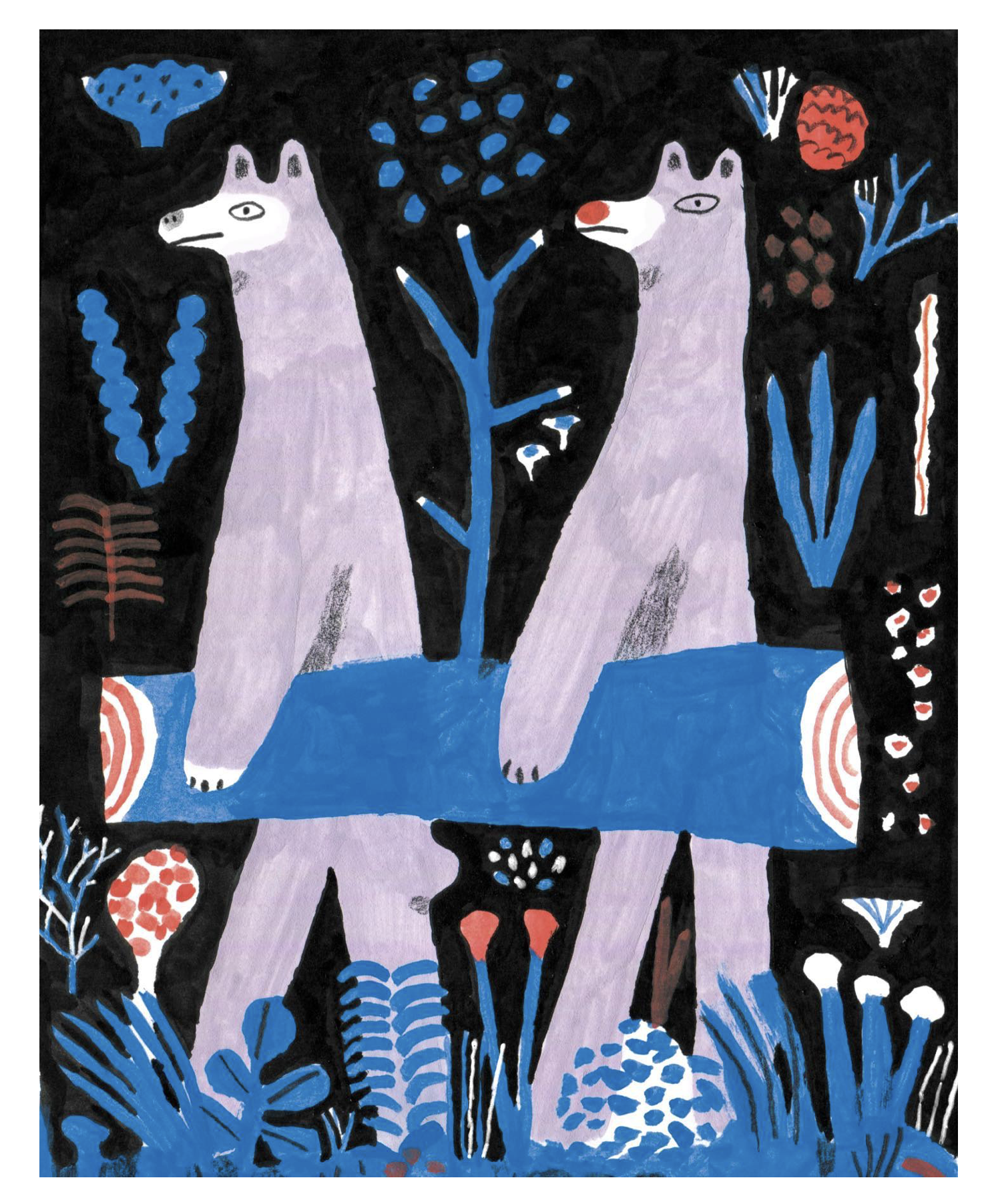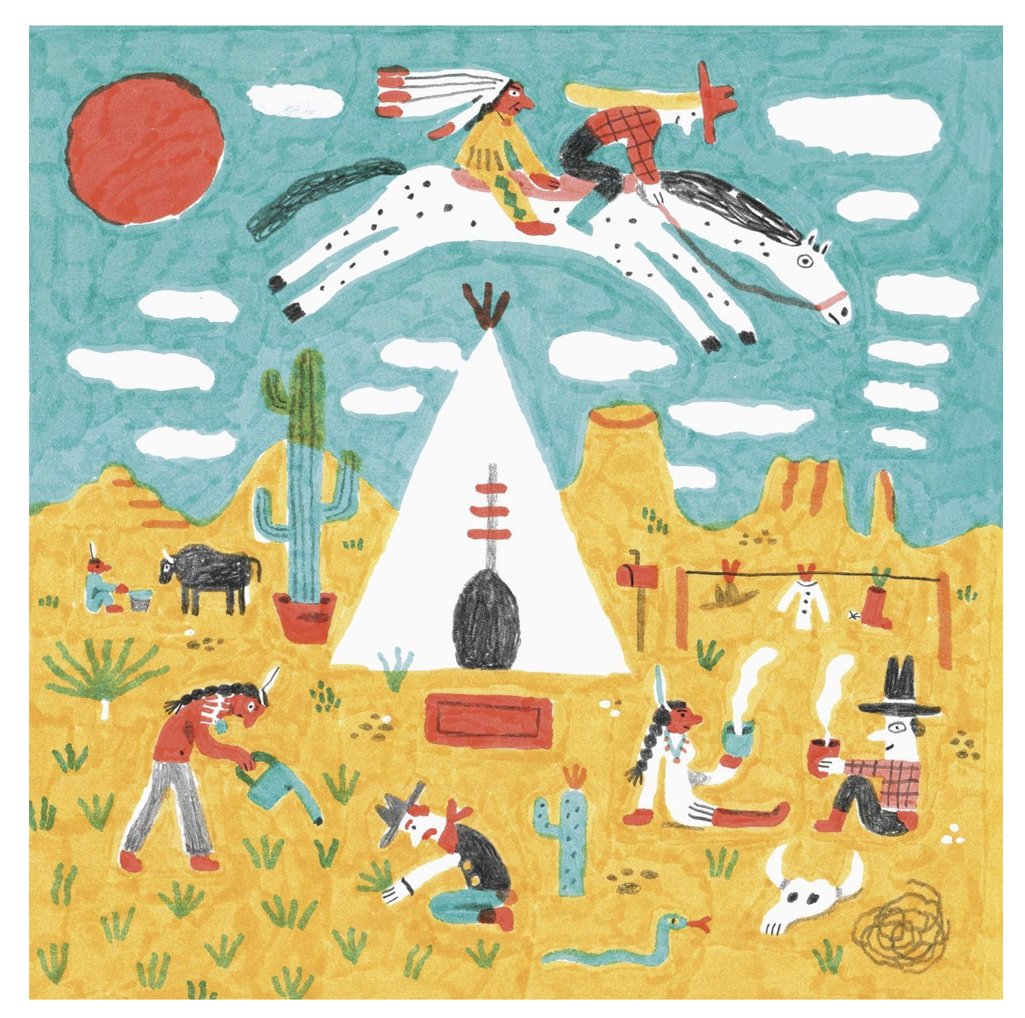 Andrea 的畫,第一眼就帶著 “不刻意的可愛”。他從不用規(guī)整的線條框定形象,反倒偏愛孩童般的 “稚拙感”:歪歪扭扭的動物輪廓、不對稱的眼睛、翹得老高的嘴角,連植物的枝葉都像剛被風吹得晃了晃 —— 比如那只圓滾滾的小熊,頂著歪歪的條紋帽子,爪子搭在蜂蜜罐上,明明線條簡單到像隨手畫的草稿,卻讓人一眼就被它的憨態(tài)逗笑。這種 “反精致” 的風格,恰恰打破了成人世界對 “完美” 的執(zhí)念,就像小時候我們趴在桌上涂畫時,從不在意線條是否筆直,只在乎筆下的角色是否 “有趣”。