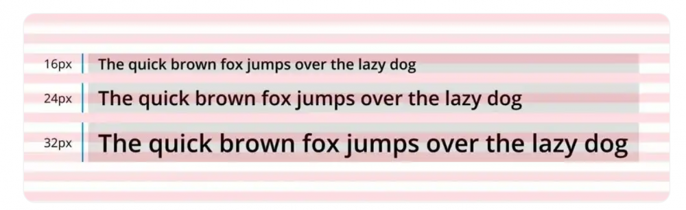 在上方的示例中,每8px行在紅色和白色之間交替。將文字的所有行高設(shè)置為基本單位(8x或4px)的倍數(shù),可以讓文本和基線網(wǎng)格完美對(duì)齊。