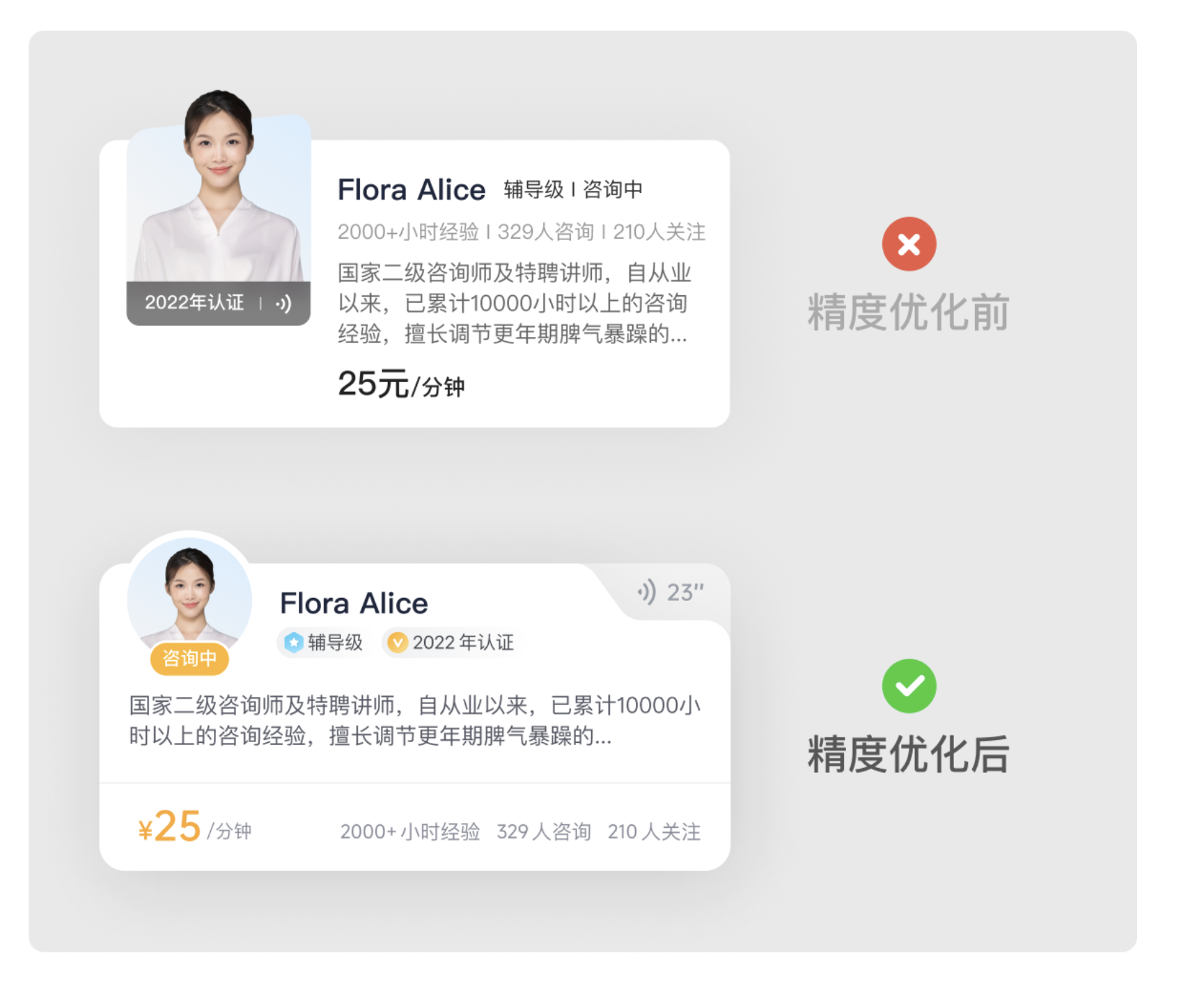卡片中的關鍵數(shù)據(jù)(如咨詢費用、經(jīng)驗時長、咨詢人數(shù))需要重點突出,但要避免多個視覺焦點沖突。可將費用 “25 元 / 分鐘” 改為 “¥25 / 分鐘”,放大字號并加粗;其他數(shù)據(jù)保持統(tǒng)一字號,用間距區(qū)分,讓用戶一眼就能捕捉到核心信息,提升決策效率。