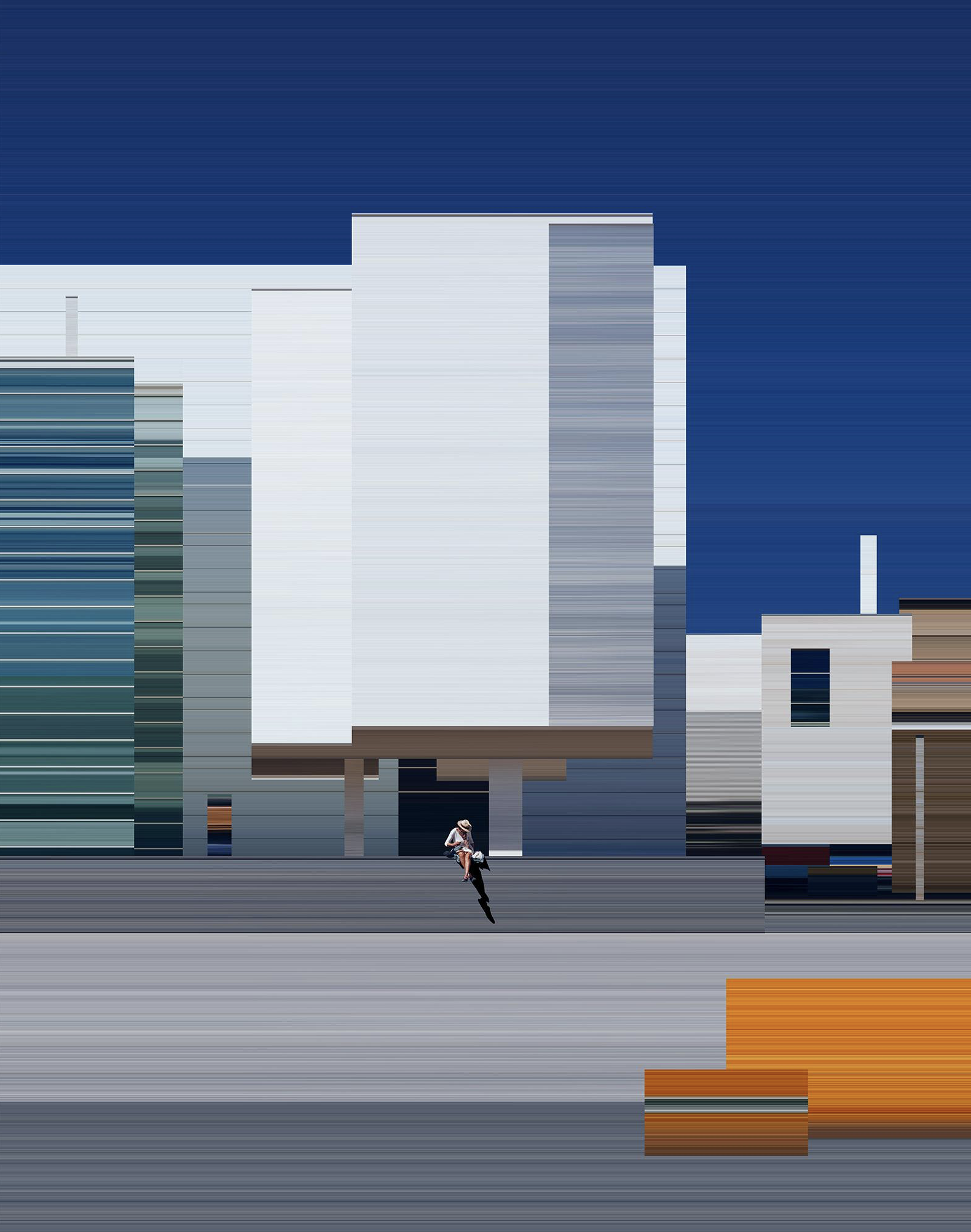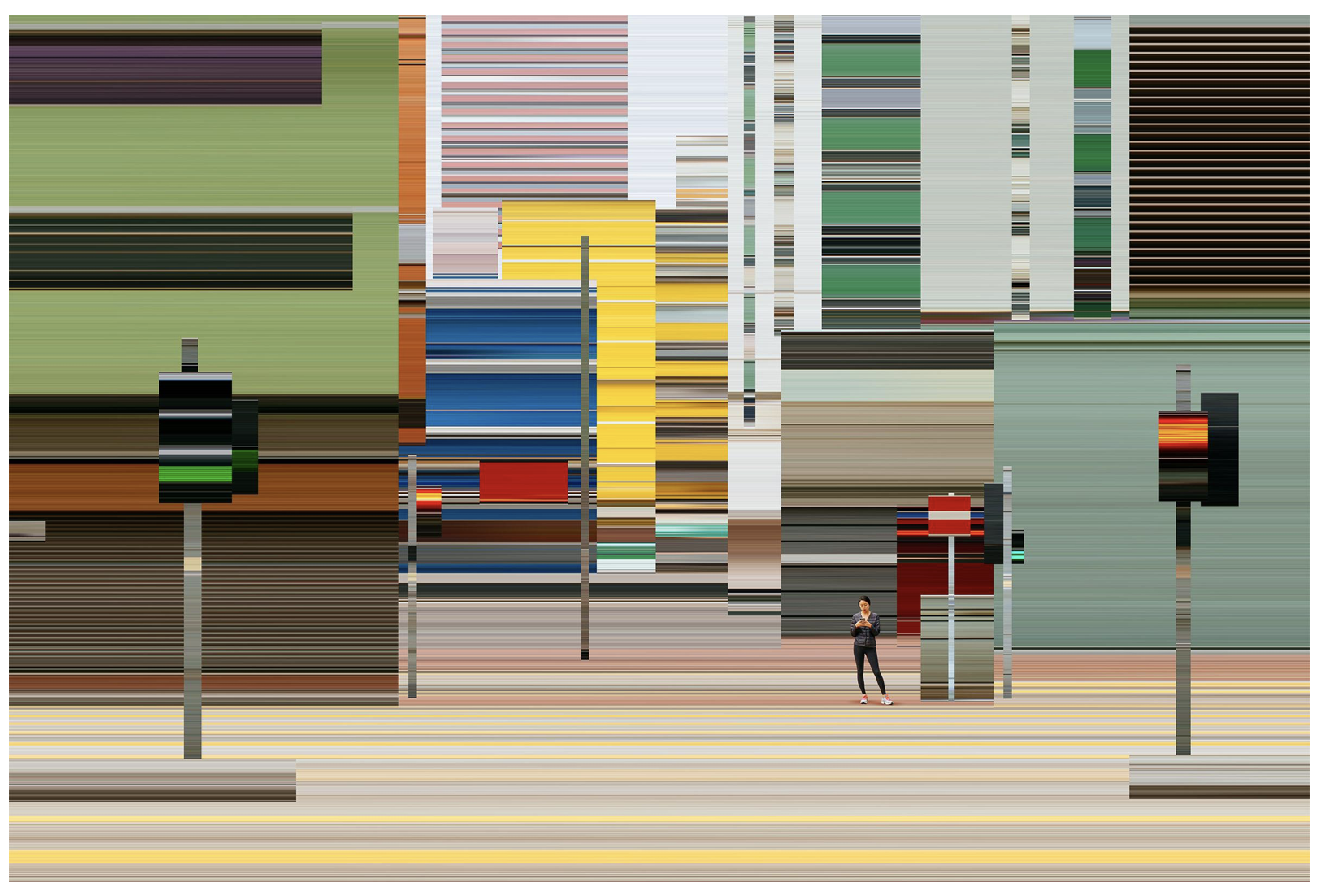 《時(shí)間拉伸》系列是一場關(guān)于感知邊界的探索,每一幅作品都構(gòu)建了一個(gè)超現(xiàn)實(shí)的視覺場域。藝術(shù)家以全球多個(gè)城市為拍攝背景,從繁華的都市街道到靜謐的自然角落,卻通過 “拉伸時(shí)間” 的創(chuàng)作手法,將周圍的環(huán)境拆解、扭曲、重組。畫面中,中央人物始終保持著清晰、穩(wěn)定的姿態(tài),仿佛被按下了暫停鍵,脫離了時(shí)間的洪流;而背景中的建筑、街道、光影則被無限拉長、模糊,化作流動(dòng)的色彩與線條,如同被時(shí)間的浪潮沖刷過的痕跡。