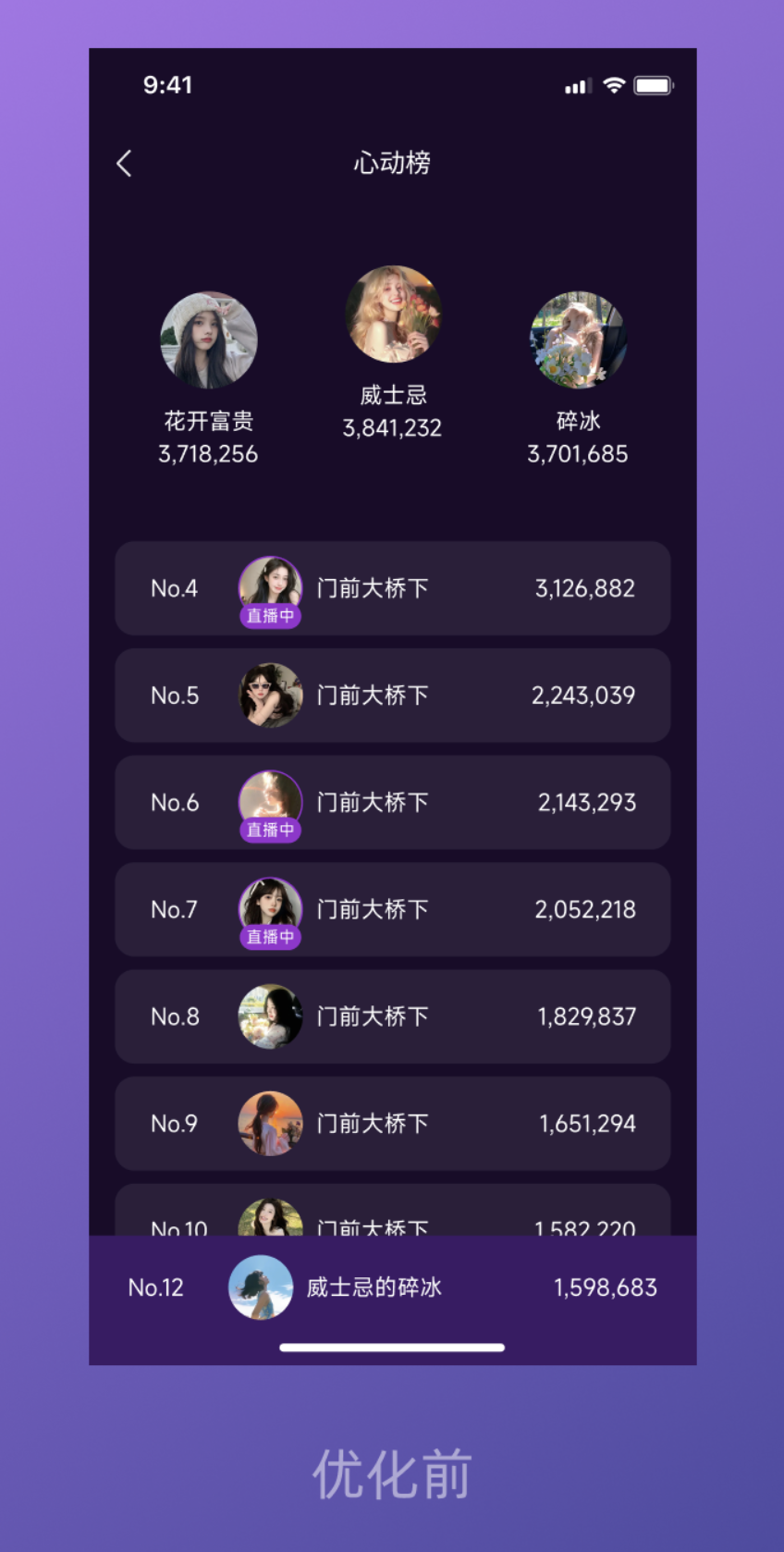 先看看優(yōu)化前的頁(yè)面狀態(tài):整體是簡(jiǎn)單的文字羅列,排名、主播名、數(shù)值雜亂排布,“直播中” 的文字標(biāo)識(shí)不醒目,前三名與后續(xù)排名沒(méi)有視覺(jué)區(qū)分,整個(gè)頁(yè)面顯得平淡無(wú)奇,用戶很難快速捕捉重點(diǎn),更談不上 “心動(dòng)” 的視覺(jué)體驗(yàn)。