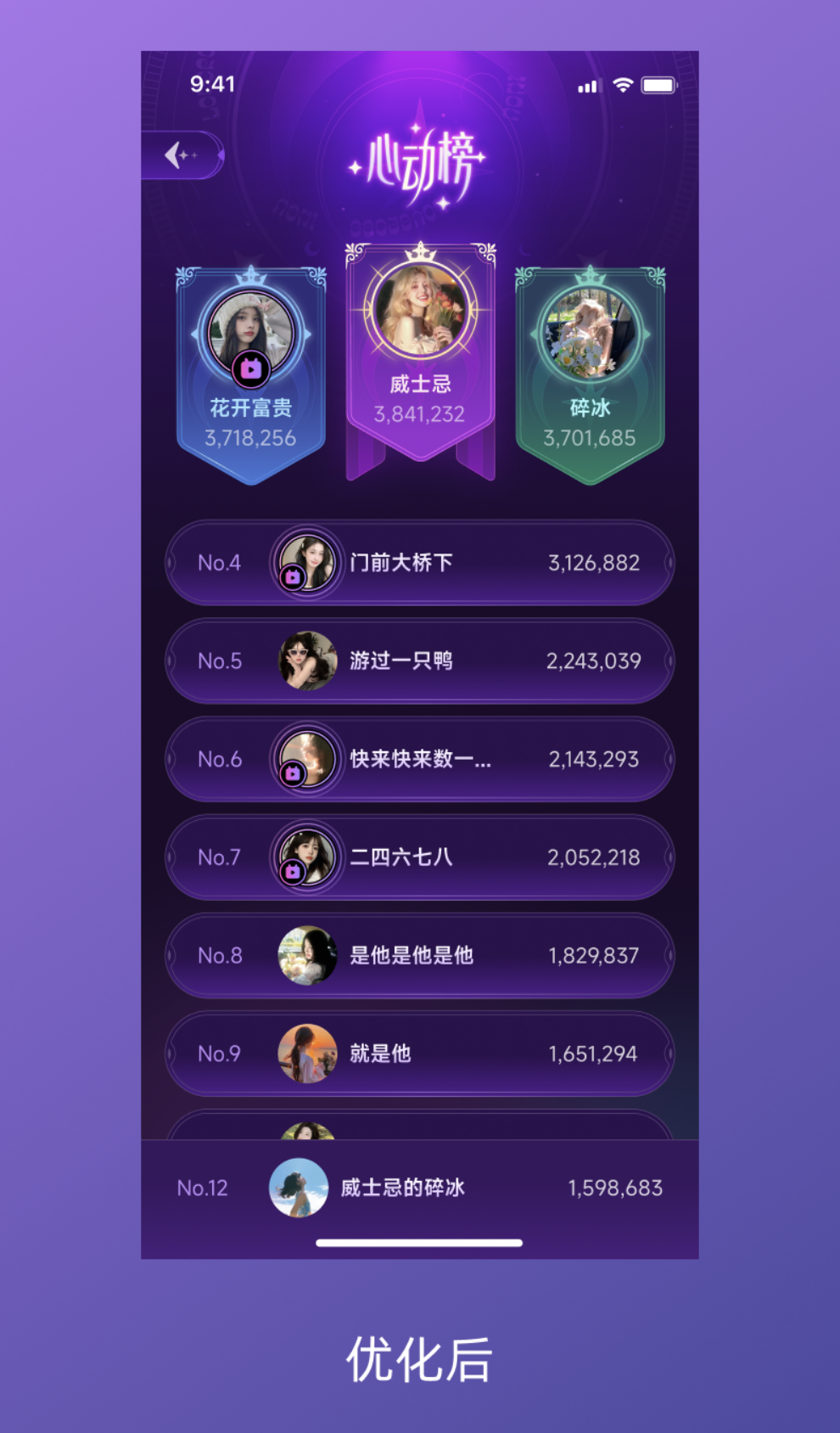 而優(yōu)化后的頁(yè)面完全煥然一新:前三名有了專(zhuān)屬視覺(jué)標(biāo)識(shí),信息層級(jí)清晰,主題風(fēng)格統(tǒng)一,細(xì)節(jié)處的設(shè)計(jì)讓普通列表秒升高級(jí)感。其實(shí)這場(chǎng) “逆襲” 并非依賴(lài)復(fù)雜設(shè)計(jì),而是抓住了三個(gè)核心優(yōu)化方向,一步步讓界面煥發(fā)生機(jī)。