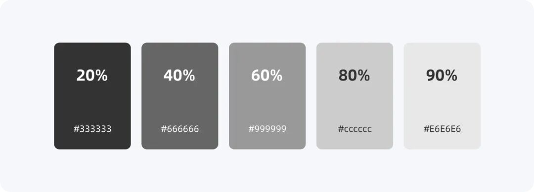 中性色即色彩中的黑白灰,設(shè)定中性色是由調(diào)整HSB(色相/飽和度/亮度)中的B值高低里形成一個(gè)表現(xiàn)視覺強(qiáng)弱的等級(jí)階梯,一般設(shè)定4~5個(gè)等級(jí)即可,例如B值的20%(#333333)、40%(#666666)、60%(#999999)、80%(#CCCCCC)、90%(#E6E6E6)。