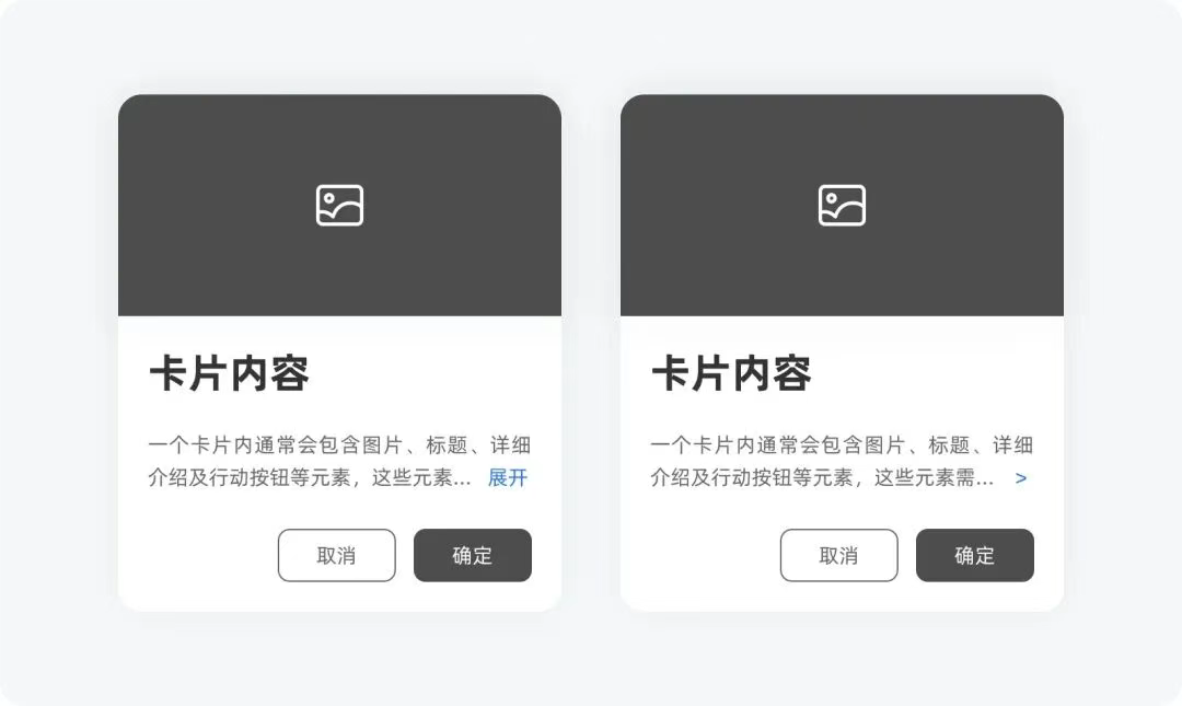 一個(gè)卡片內(nèi)通常會(huì)包含圖片、標(biāo)題、詳細(xì)介紹及行動(dòng)按鈕等元素,這些元素需要以聚焦的形式去呈現(xiàn),以幫助用戶快速掃描內(nèi)容。當(dāng)文本內(nèi)容較長、展示的信息過多時(shí),不利于用戶快速掃描,導(dǎo)致用戶無法在第一時(shí)間快速感知到產(chǎn)品想要展示的、或用戶想要知道的信息,很容易被用戶過濾。