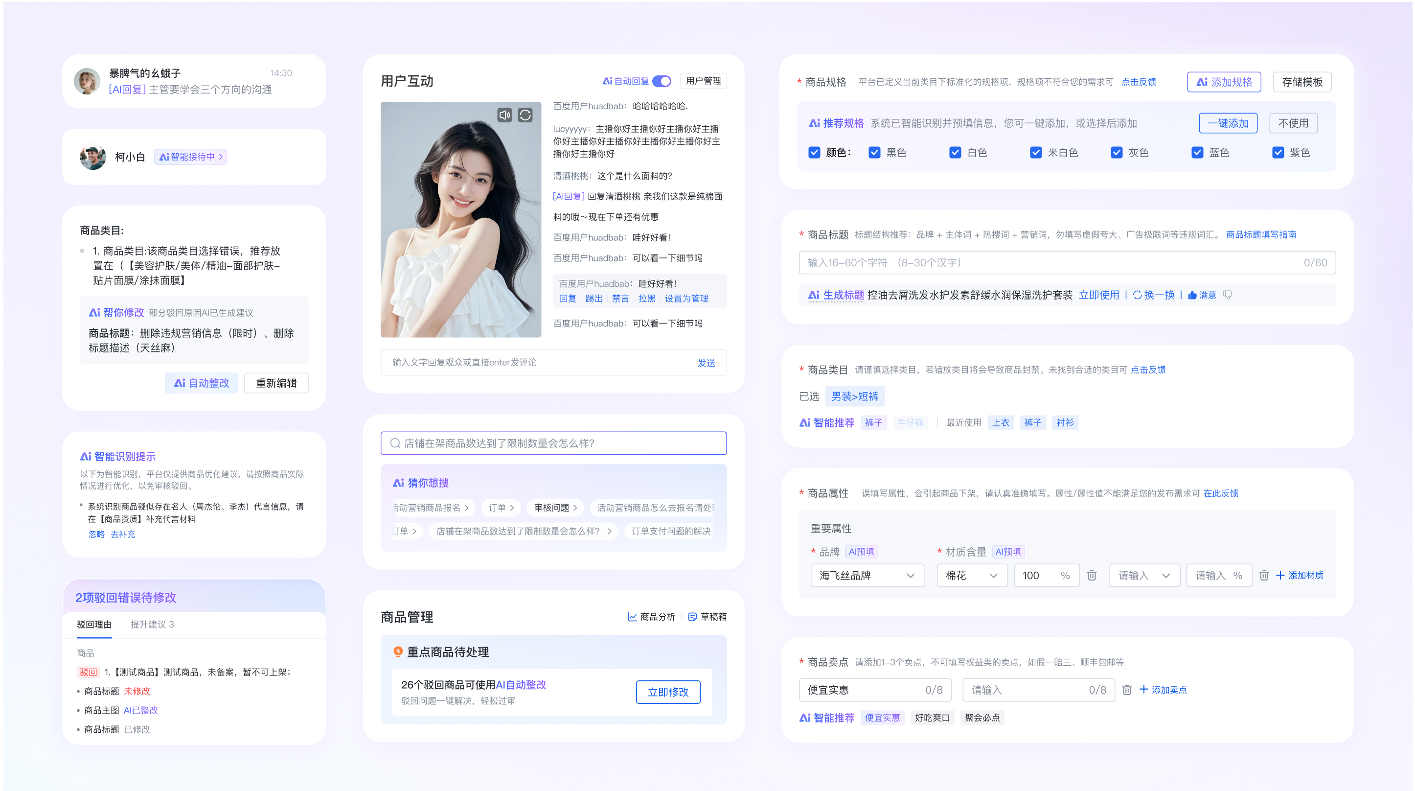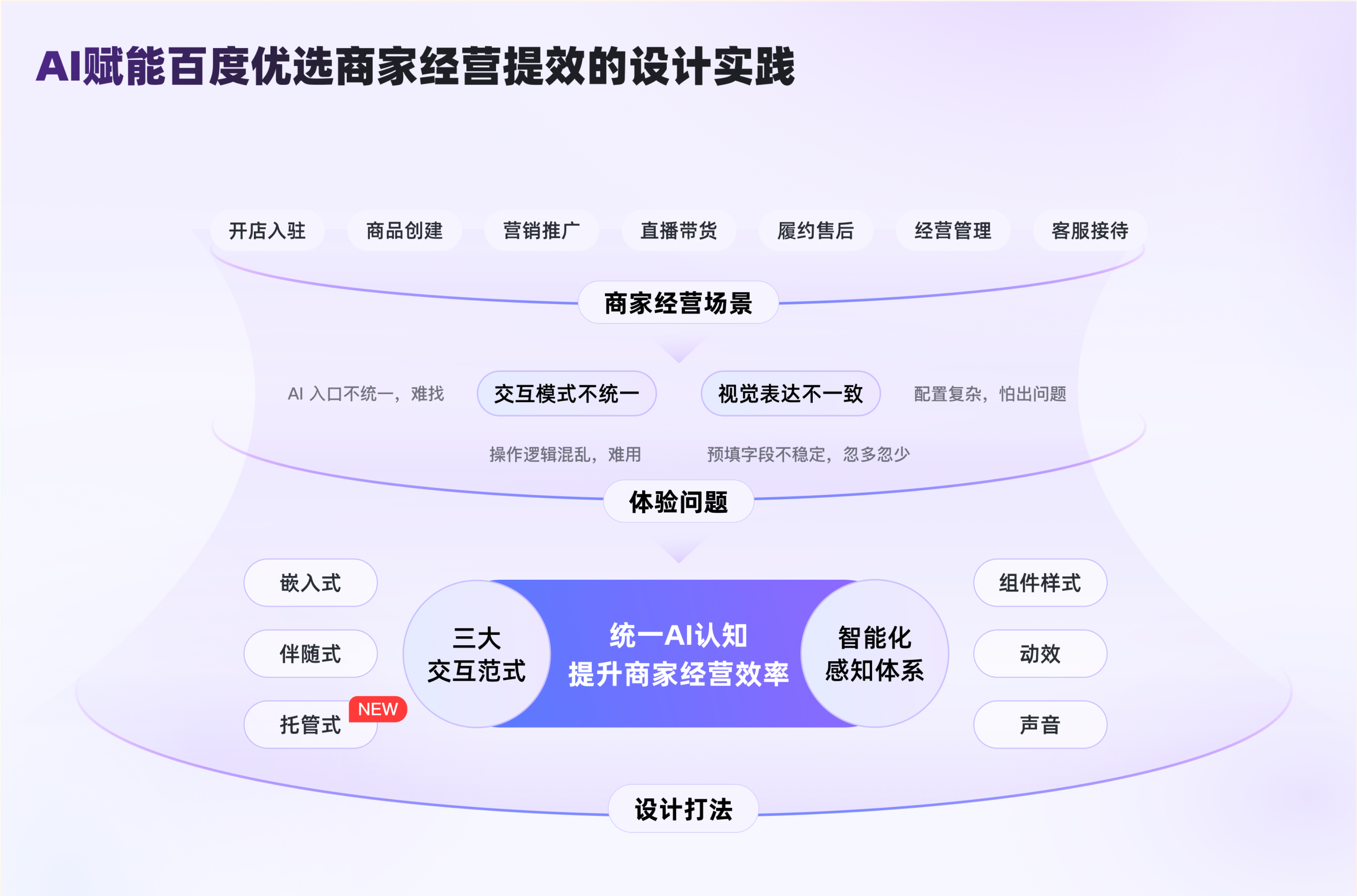 本次百度優(yōu)選商家后臺(tái) AI 體驗(yàn)升級(jí),始終以 **“以商家提效為中心”** 為設(shè)計(jì)核心,通過(guò) “場(chǎng)景篩選適配 + 交互形態(tài)創(chuàng)新”,落地嵌入式、伴隨式、托管式三大交互范式,精準(zhǔn)破解商品創(chuàng)建、多線(xiàn)程經(jīng)營(yíng)、客服接待等核心場(chǎng)景的使用痛點(diǎn);同時(shí)構(gòu)建 “視覺(jué) + 多感” 的智能化感知體系,從根本上解決商家 “不會(huì)用、不敢信” 的體驗(yàn)困境。