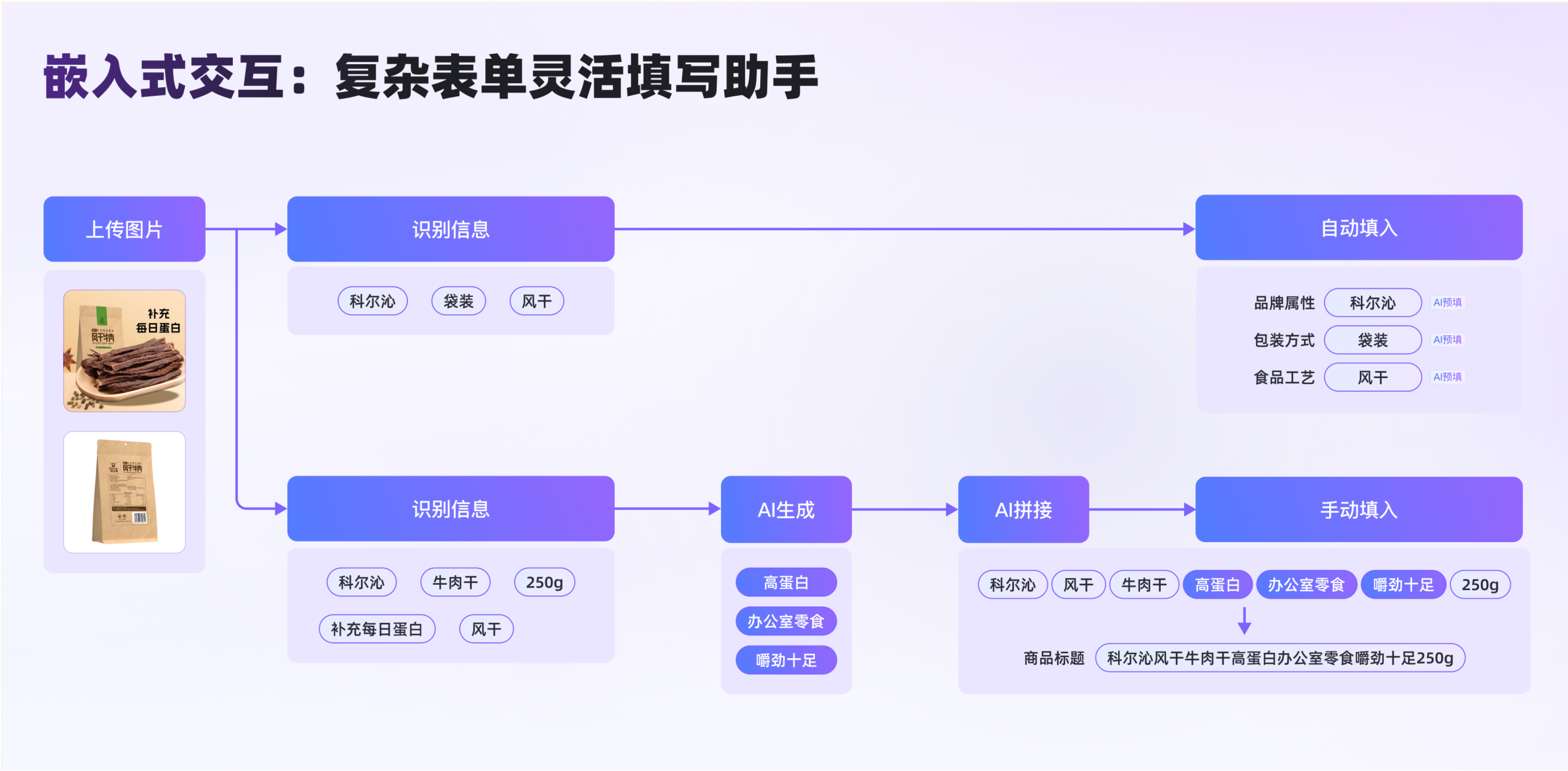 嵌入式交互的核心是讓 AI 生成結(jié)果緊鄰用戶(hù)操作場(chǎng)景,實(shí)現(xiàn)輕量便捷的交互體驗(yàn),核心適配復(fù)雜表單填寫(xiě)類(lèi)場(chǎng)景,以商品創(chuàng)建環(huán)節(jié)為典型代表 —— 該環(huán)節(jié)字段繁多、手動(dòng)填寫(xiě)耗時(shí)久,且易因填寫(xiě)不規(guī)范被審核駁回,嚴(yán)重拉長(zhǎng)發(fā)品周期。針對(duì)這一問(wèn)題,我們根據(jù)字段特征與 AI 能力類(lèi)型,設(shè)計(jì)了兩種差異化交互流程:
