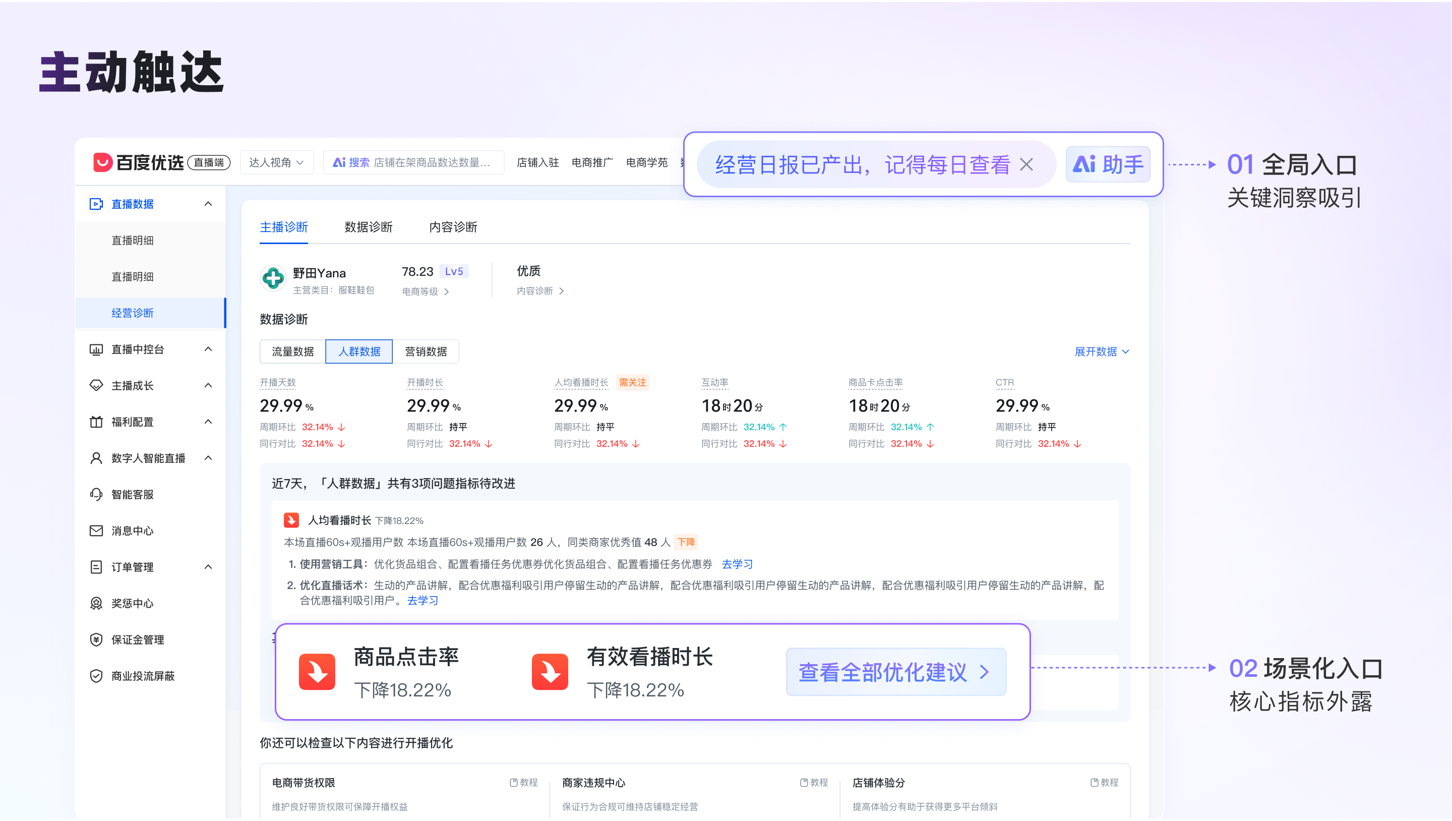 針對(duì)商家多線(xiàn)程經(jīng)營(yíng)時(shí)需頻繁跳轉(zhuǎn)各模塊、需自主發(fā)現(xiàn)經(jīng)營(yíng)問(wèn)題的痛點(diǎn),我們打造了深度融入經(jīng)營(yíng)動(dòng)線(xiàn)的伴隨式交互方案,聚焦 **“主動(dòng)觸達(dá)、連續(xù)洞察”** 兩大核心,讓 AI 助手跳出常規(guī)對(duì)話(huà)機(jī)器人的被動(dòng)響應(yīng)模式,轉(zhuǎn)變?yōu)榻Y(jié)合工作流前后場(chǎng)景、提供落地行動(dòng)指引的經(jīng)營(yíng)輔助工具。