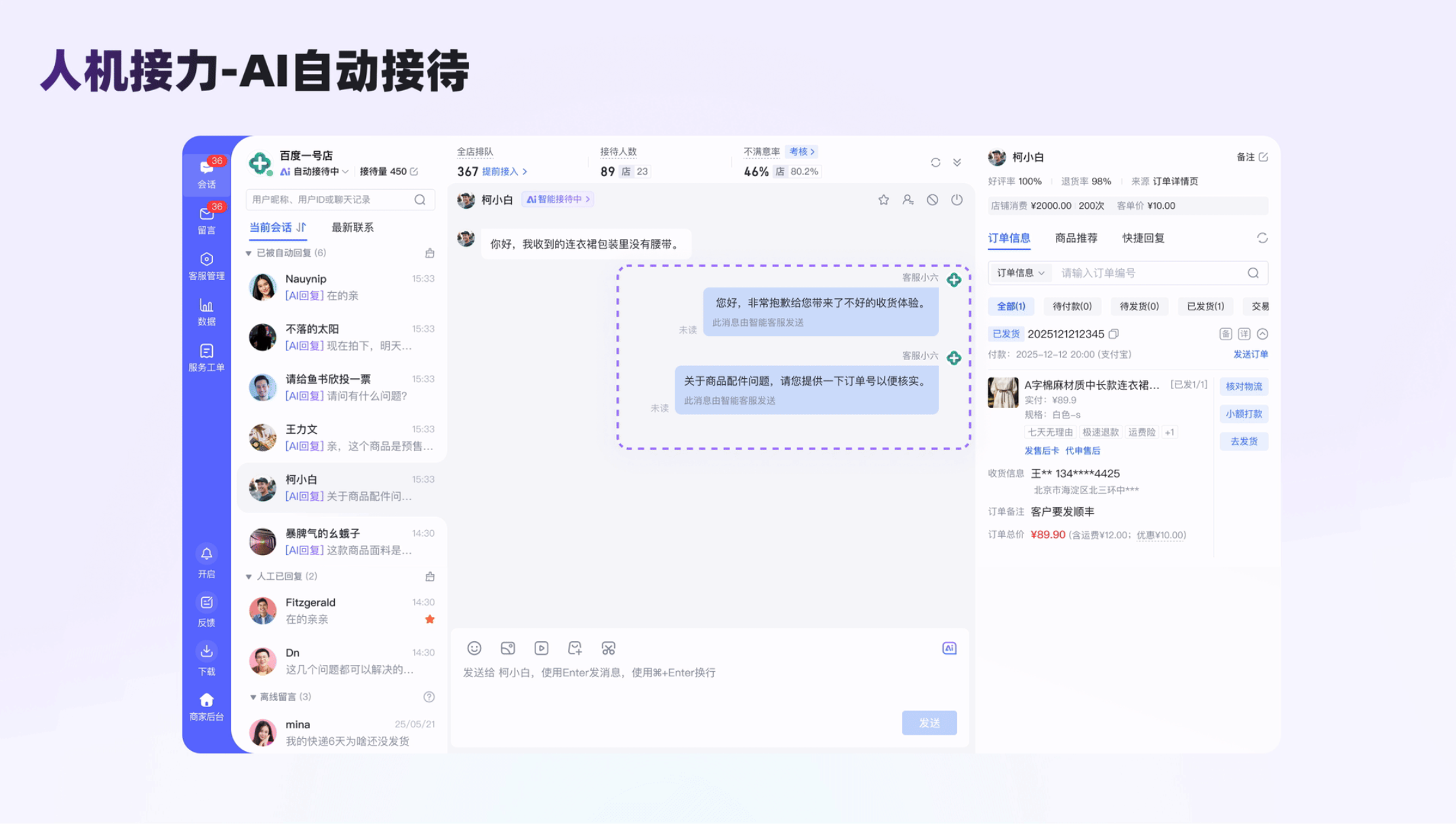 2. 明確狀態(tài)標(biāo)識(shí),實(shí)現(xiàn)流暢人機(jī)接力:為保障人機(jī)協(xié)同的順暢性,界面中對(duì)接待狀態(tài)進(jìn)行全方位清晰標(biāo)識(shí):全局接待狀態(tài)置頂實(shí)時(shí)更新、會(huì)話(huà)列表按狀態(tài)動(dòng)態(tài)分組、單人接待狀態(tài)(接待中 / 暫停接待)強(qiáng)化并自動(dòng)同步。當(dāng) AI 無(wú)法解答復(fù)雜訴求、用戶(hù)負(fù)面情緒等問(wèn)題時(shí),會(huì)話(huà)將自動(dòng)流轉(zhuǎn)至 “待人工回復(fù)” 分組,通過(guò)動(dòng)態(tài)高亮 + 聲音預(yù)警提醒人工快速接管;人工回復(fù)后,AI 將自動(dòng)暫停并更新接待狀態(tài),同時(shí)生成會(huì)話(huà)摘要,幫助工作人員快速了解溝通前因后果,將決策焦點(diǎn)從 “梳理問(wèn)題” 轉(zhuǎn)向 “解決問(wèn)題”。此外,客服可主動(dòng)設(shè)置 “恢復(fù)托管”,AI 也會(huì)在識(shí)別新會(huì)話(huà)時(shí)自動(dòng)恢復(fù)接待,形成閉環(huán)的人機(jī)協(xié)同機(jī)制。image.png