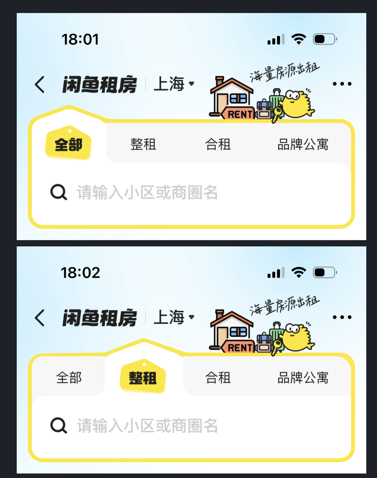 閑魚租房欄目的卡片設(shè)計便是典型,它摒棄了常規(guī)的矩形卡片框架,將房屋結(jié)構(gòu)的輪廓融入卡片造型,用極簡的幾何圖形還原戶型特征,既貼合租房的業(yè)務(wù)核心,又讓卡片設(shè)計跳出了同質(zhì)化的視覺桎梏。這種將業(yè)務(wù)特征與視覺設(shè)計結(jié)合的方式,不僅讓卡片更有辨識度,還能讓用戶一眼感知到功能屬性,實(shí)現(xiàn)了美觀與實(shí)用的雙重效果。