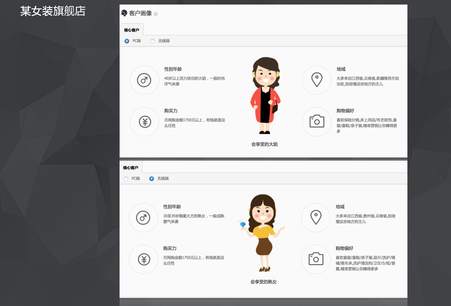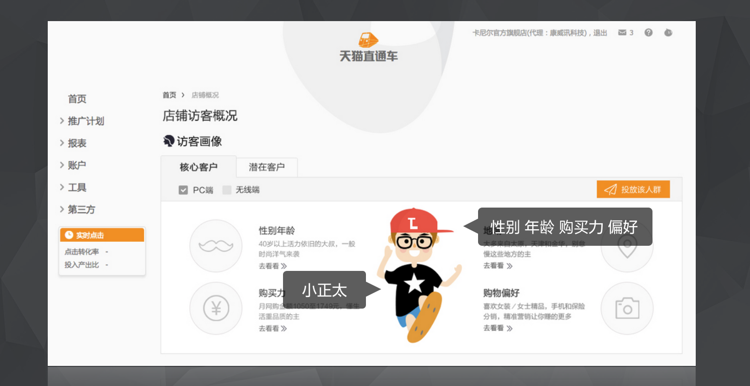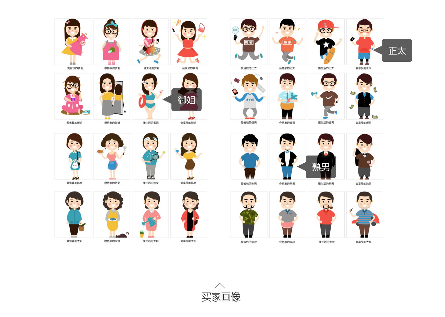通過(guò)購(gòu)買力,性別,年齡,偏好4個(gè)緯度來(lái)將訪客劃分為不同的類型,用手繪的形式來(lái)代替文案,讓用戶在短時(shí)間內(nèi)更容易的了解到到店訪客的情況。