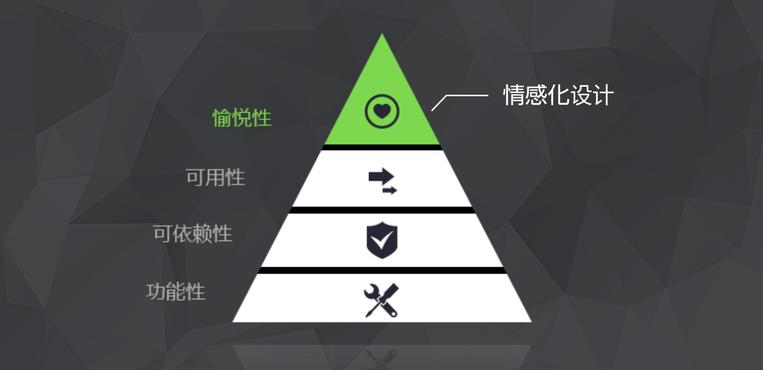 《情感化設(shè)計(jì)心理學(xué)中》作者唐納德·諾曼將情感化設(shè)計(jì)與馬斯洛的人類需求層次理論聯(lián)系了起來(lái)。 產(chǎn)品特質(zhì)也可以被劃分為功能性、可依賴性、可用性和愉悅性這四個(gè)從低到高的層面,而情感化設(shè)計(jì)則處于其中最上層的“愉悅性”層面當(dāng)中。