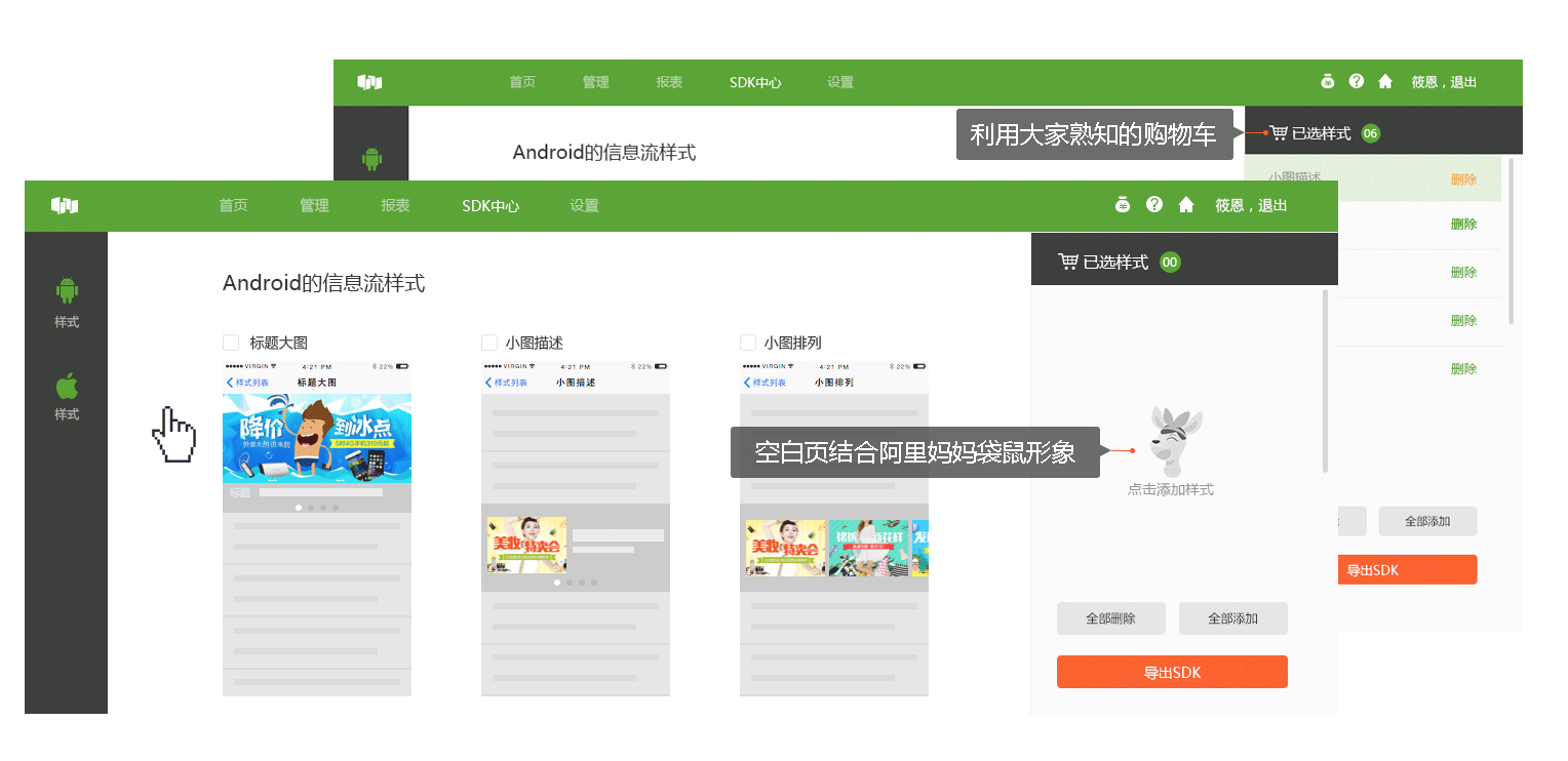 在新品介紹中加入了阿里媽媽袋鼠的品牌形象,一方面做到了,品牌的滲透。阿里媽媽袋鼠吉祥物在PC產(chǎn)品端落地的,另一方面可以通過(guò)帶有表情的卡通形象,傳達(dá)給用戶相關(guān)的信息。