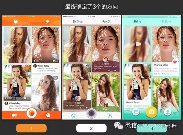 最后如上圖,根據(jù)評審我們選出了票數(shù)最高的三個不同風(fēng)格的方案,理論上我們認為這三個方案都是正確的、內(nèi)部達成一致、且都符合我們在『情感關(guān)鍵詞』 和『情緒板』分析時『陽光溫暖年輕』的設(shè)計目標(biāo)。但是三個是不同風(fēng)格各有千秋,而且我們都挺喜歡的,要怎么抉擇呢?最后就要試探一下用戶的感覺了。