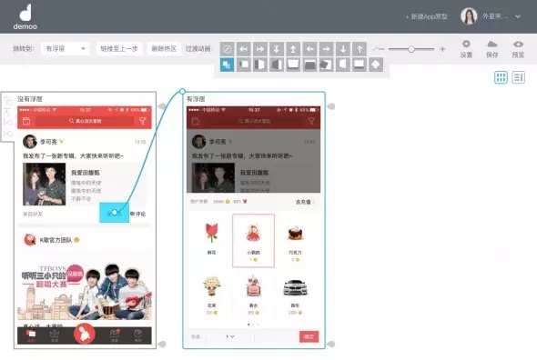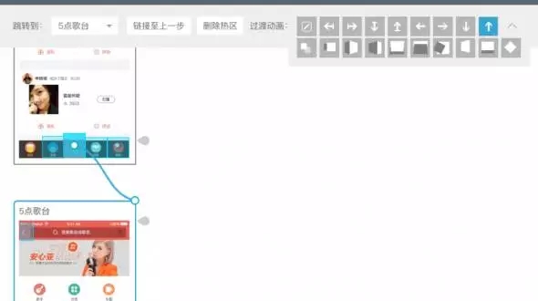 真實的app中,頁面間常常通過方向來示意層級關系,例如重新創(chuàng)建的流程,通常創(chuàng)建頁面會從底部向上呼起,于是,在建立熱區(qū)鏈接過程時,我們需要對鏈接進行方向設定。如圖示,我將點歌臺呼起的頁面出現形式,設定為從下往上出。如果不是很確定切換效果,Demoo很細心的在這里設計了動畫預覽,鼠標停留在小方塊上時,會有微動畫示意,多看幾遍也就明白了。