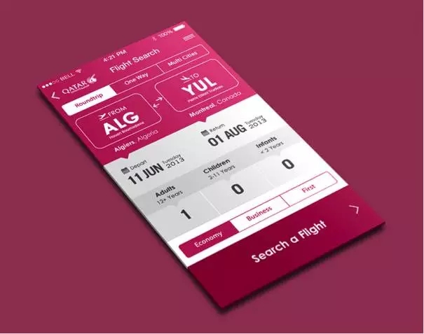 卡塔爾公司航空就是這樣的設(shè)計案例,整個界面采用粉色的主色調(diào),從標(biāo)題欄到標(biāo)簽頁,從操作按鈕到提示信息,除了黑白灰之外,全部采用粉色設(shè)計,這種簡介的的配色風(fēng)格,反倒起到了很好的信息傳達效果,也具有良好的視覺表現(xiàn)力,設(shè)計師在內(nèi)容排版上的技巧實在是加分。