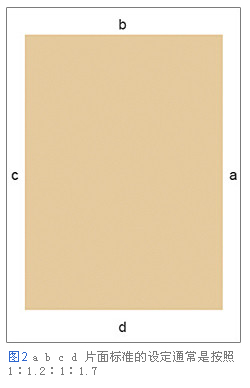 首先在書籍編排過(guò)程中,設(shè)定頁(yè)面四周的余白來(lái)安排頁(yè)面的排版。頁(yè)邊空白的大小不同,排版效果給讀者帶來(lái)的印象也會(huì)發(fā)生變化,因此需要適當(dāng)?shù)剡M(jìn)行處理。雖然紙質(zhì)書籍已經(jīng)有了莫里斯所提倡的版面設(shè)定理論,但是這些理論并不適合于顯示在硬件設(shè)備上。因此我們需要根據(jù)不同的媒體特點(diǎn)來(lái)進(jìn)行處理。如圖(2) 有顏色的部分是版面,abcd版面標(biāo)準(zhǔn)的設(shè)定通常是按照1:1.2:1:1.7的比例來(lái)進(jìn)行設(shè)計(jì)。