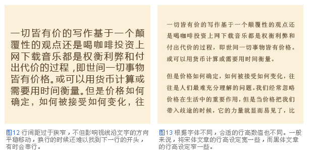 我們?cè)谠O(shè)計(jì)工作中,頭腦中往往會(huì)存有某種標(biāo)準(zhǔn),并且會(huì)以之作為排版工作的標(biāo)準(zhǔn)。但是實(shí)際工作中總會(huì)有些具體情況,例如對(duì)于對(duì)話較多的原創(chuàng)類書箱而言,行距稍微小一些也沒關(guān)系,而對(duì)于出版類書箱這樣段文字較多,或者論文這樣比較晦澀的內(nèi)容來(lái)說(shuō),行距大一些會(huì)比較便于閱讀。當(dāng)然讀者的年齡也是很重要的問題。像這樣的觀點(diǎn)還是與自己的閱讀經(jīng)驗(yàn)直接相關(guān)的。