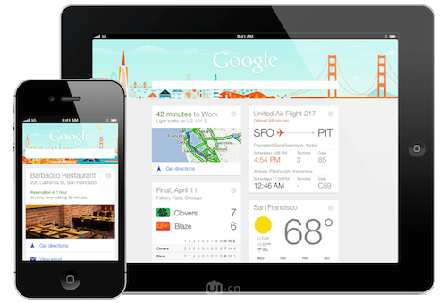 我們都知道你的app和網(wǎng)站在不同的設(shè)備下保持適配是一件很重要的工作。而卡片式設(shè)計就能很好的幫助我們來完成這一點。卡片式設(shè)計從根本上來說就是將頁面內(nèi)容進行分解,然而再整合一個無法再進行分解的元素。而響應(yīng)式設(shè)計要求的就是我們可以根據(jù)屏幕尺寸的大小對頁面內(nèi)容就行調(diào)整。卡片式設(shè)計就可以對頁面內(nèi)容進行分割重組來適應(yīng)不同的屏幕。比如這個Google在手機設(shè)備上顯示一個卡片,pad端顯示兩個卡片。