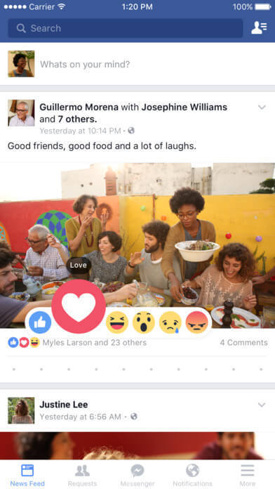 Facebook中好友的每條動態(tài)都是以一張卡片的形式展現(xiàn)的。用戶可以很快的完成對頁面信息的讀取。你可以不斷的往下滑查看更多的好友動態(tài)。你也可以看到多少人點贊,多少人評論與分享。這些功能誘導(dǎo)用戶積極參與互動,增加傳播性。