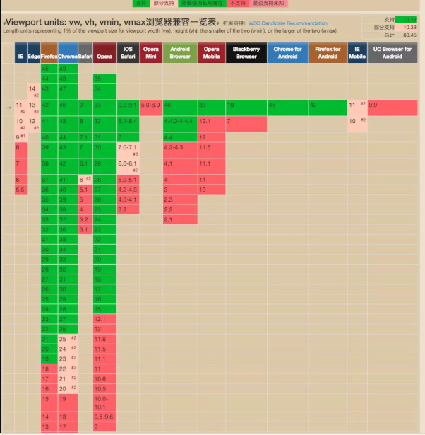 vw這個(gè)vw的方案,相當(dāng)而言還比較新。vw 即(viewport width)可視窗口的寬度。之所以把這個(gè)方案放在后面來(lái)說(shuō),是因?yàn)関iewport在去年(2017年)的時(shí)候存在不少的兼容性問題,各個(gè)瀏覽器的支持并不是很好。但是來(lái)到了2018年這個(gè)時(shí)間點(diǎn),viewport單位意見得到了眾多瀏覽器的支持(80.45%)。